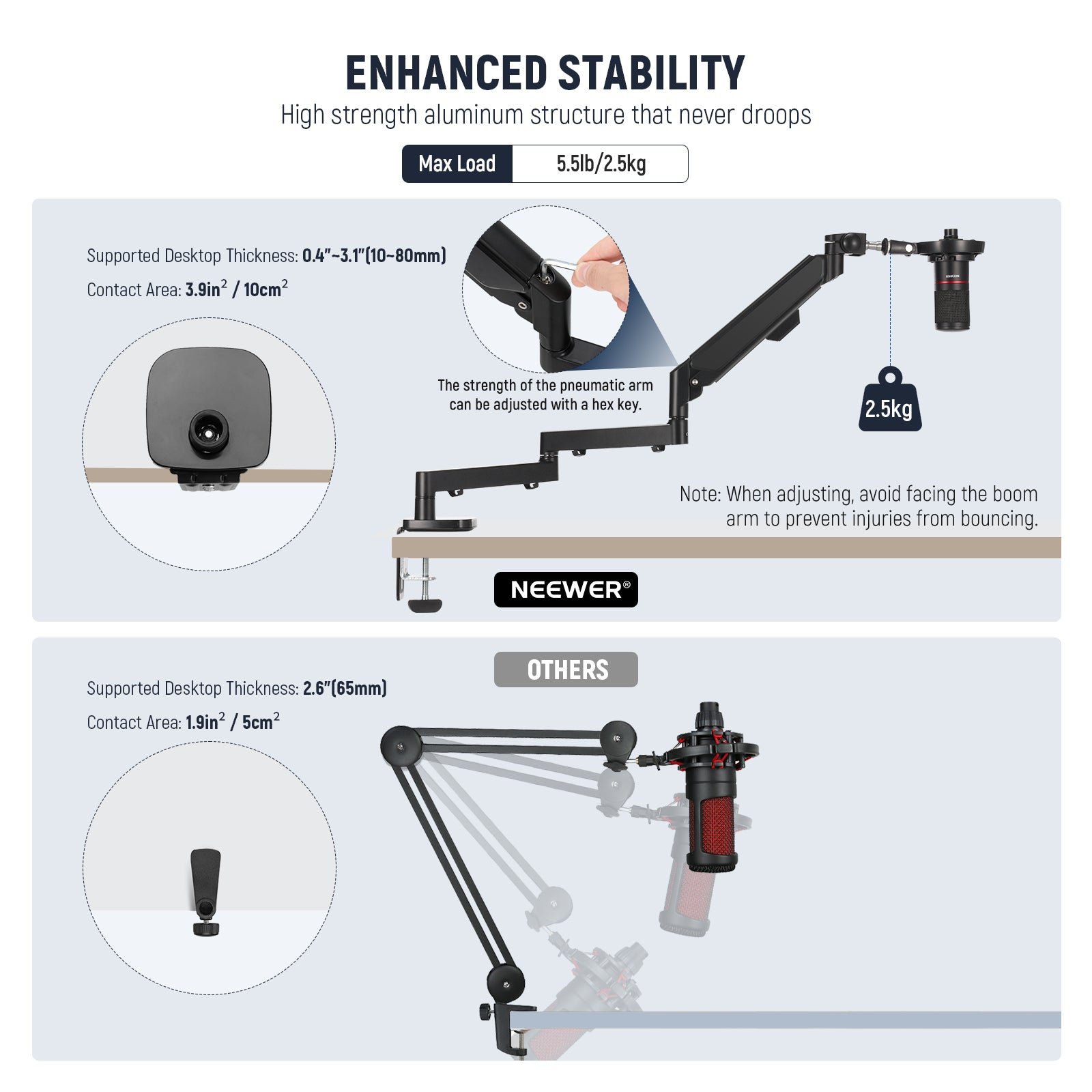 - Braccio professionale pneumatico e caricato a molla : dotato di un avanzato sistema di bilanciamento pneumatico e carichi a molla integrati, il braccio è progettato per un posizionamento rapido e stabile, anche con microfoni più pesanti (la forza di rimbalzo è regolabile). Garantisce un movimento silenzioso e fluido del microfono durante la registrazione audio video, lo streaming live o la trasmissione, con una capacità di carico massima di 2,5 kg/5,5 libbre. Nota: durante la regolazione, evitare di stare di fronte al braccio del braccio per evitare lesioni dovute al rimbalzo.