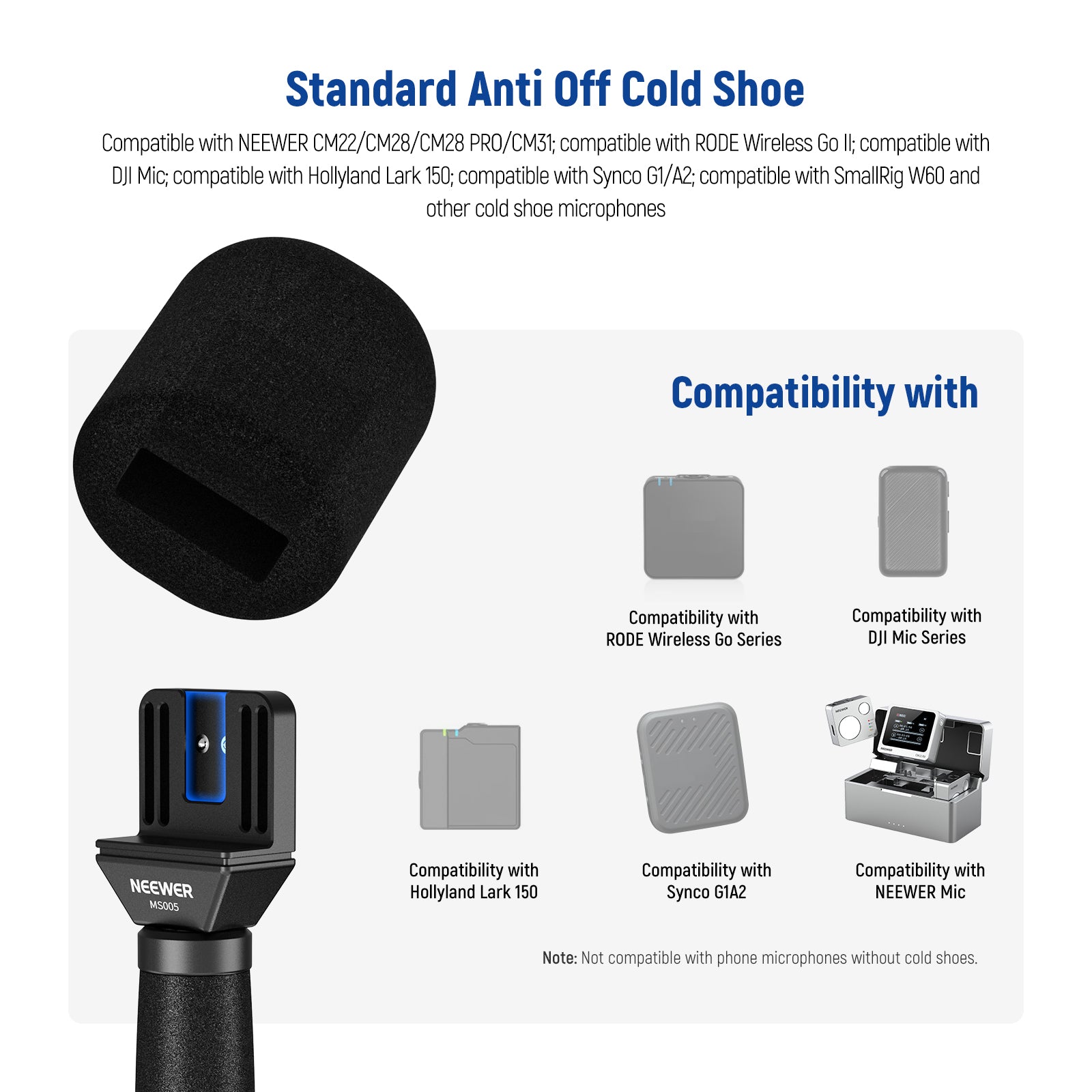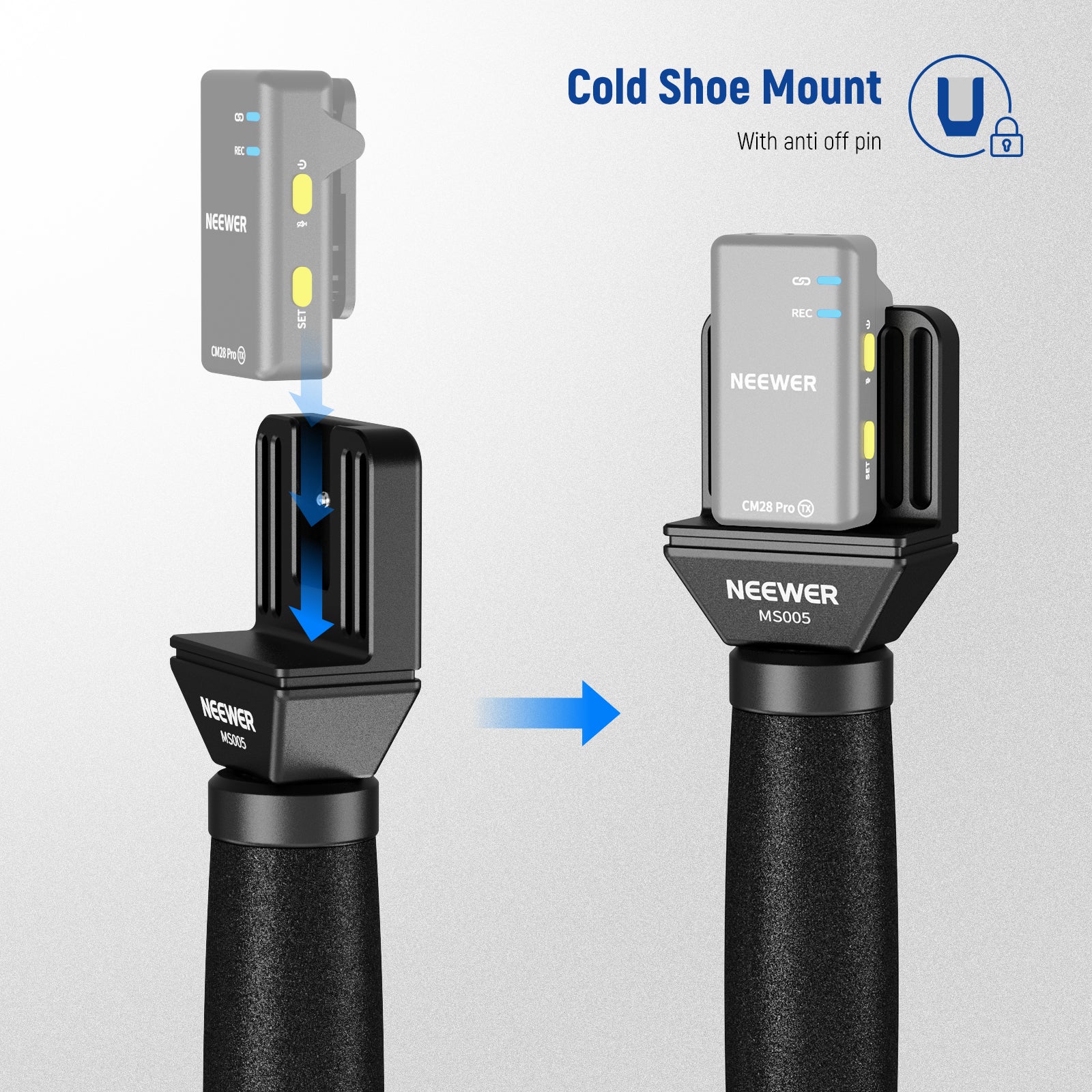 - Cold Shoe Anti-Slittamento Standard - Questa impugnatura per microfono è dotata di un cold shoe anti-slittamento che monta verticalmente il tuo lavalier wireless e ne impedisce la caduta. Compatibile con NEEWER CM31; compatibile con RODE Wireless Go II 2; compatibile con DJI Mic; compatibile con Hollyland Lark 150; compatibile con Synco G1/A2; compatibile con SmallRig W60 e altri microfoni a clip con cold shoe.