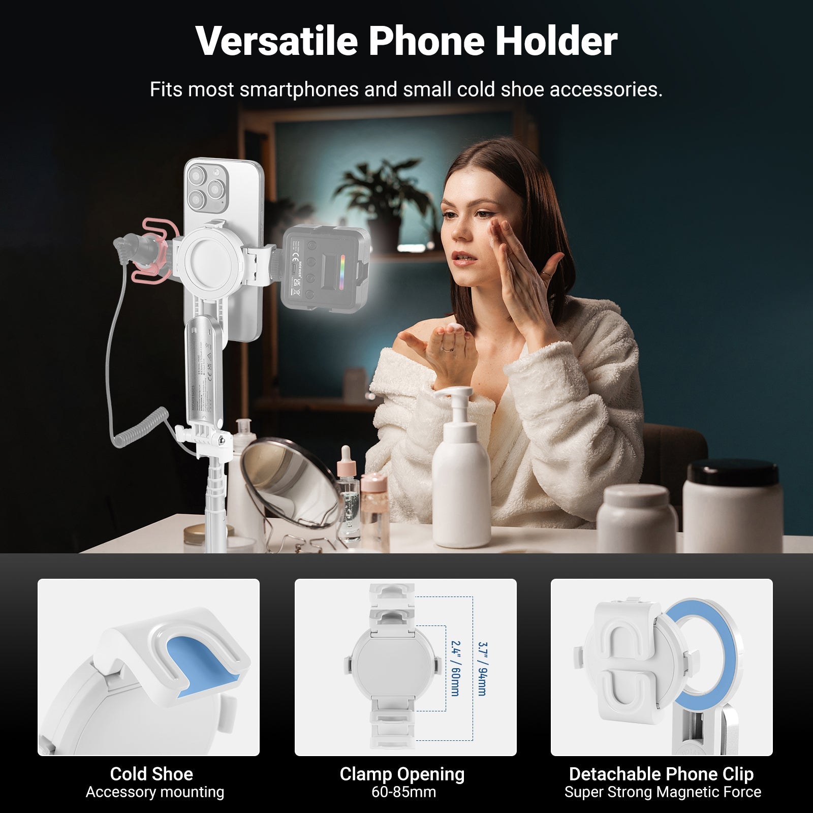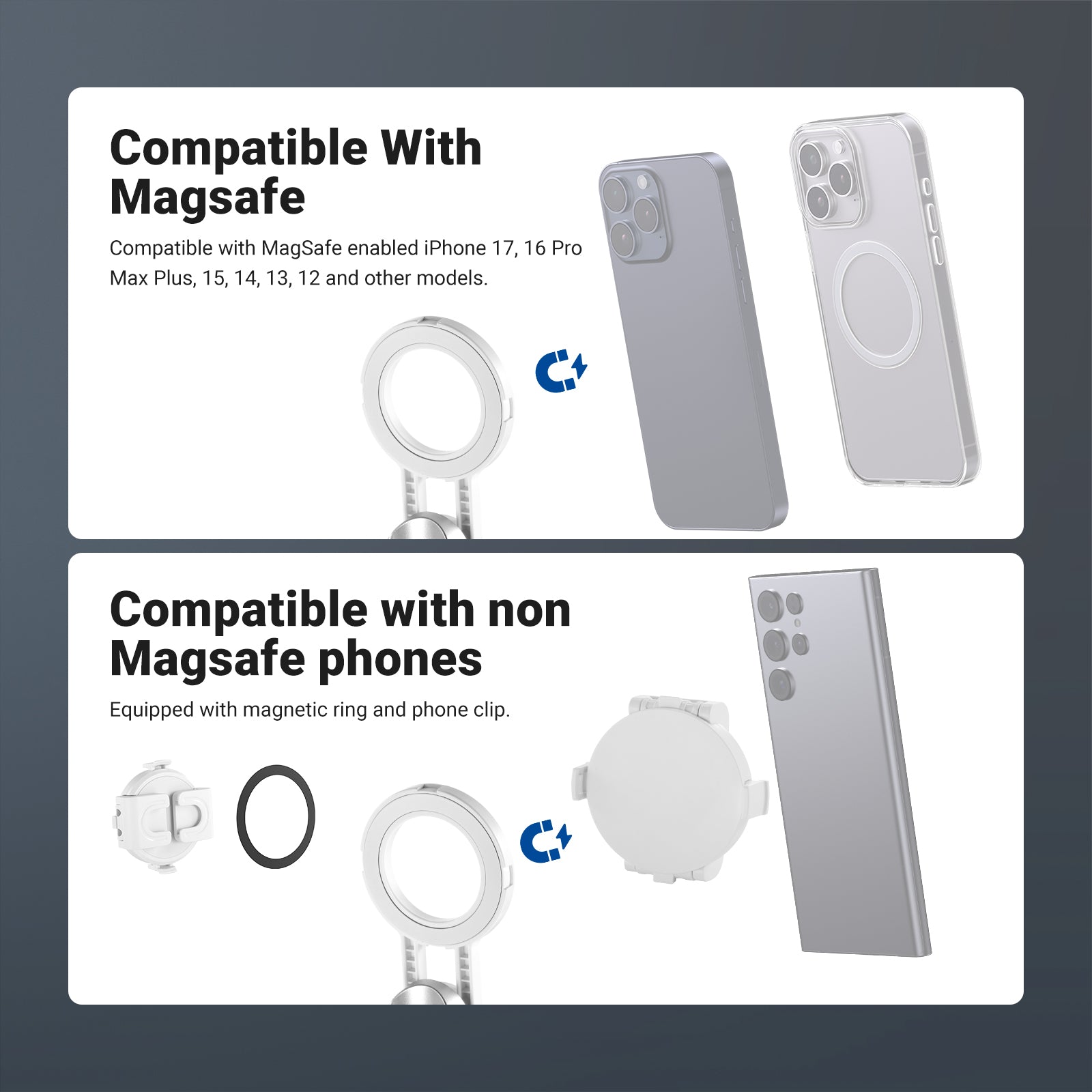 - Supporto universale per telefono a 360° - Con un'apertura di 2,4"-3,3"/60-85 mm, il morsetto per telefono è compatibile con iPhone 16 Pro Max, iPhone 15 Pro Max, Samsung Galaxy S24 Ultra e altri smartphone. La rotazione di 360° consente riprese verticali e orizzontali, mentre l'inclinazione di 225° offre angoli di ripresa variabili.