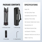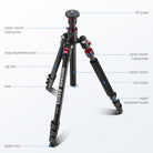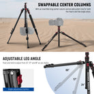 - 2 Axis Flexible Center Column- 1. The unique design of the center column consisting of 2 sections enables the maximum height of the tripod and monopod to be higher; 2. The center axis can be inverted for macro photography, or completely detached for low angle shooting; 3. Combine the center column and the legs as a regular camera tripod, and reverse the legs when stored. Includes a handy hook to hang sandbags (not included) for increased stability