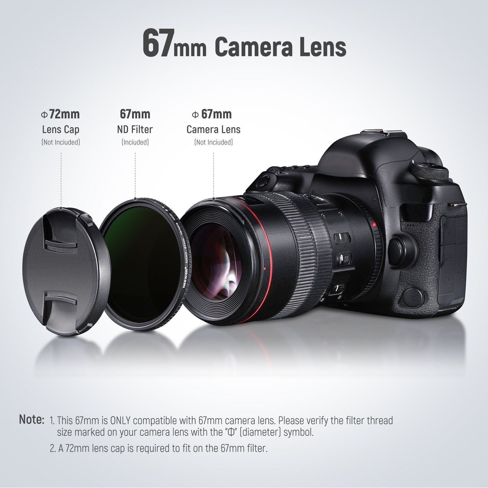 - Informazioni sulla sua compatibilità : questo filtro ND può adattarsi solo a un obiettivo della fotocamera della stessa dimensione. Si prega di confermare la dimensione della filettatura del filtro contrassegnata sulla fotocamera con il simbolo "Ф" (diametro) prima di ordinare. Quando montato sulla fotocamera, il filtro ND protegge anche l'obiettivo della fotocamera dai graffi. Sono inclusi anche una custodia protettiva e un panno per la pulizia.