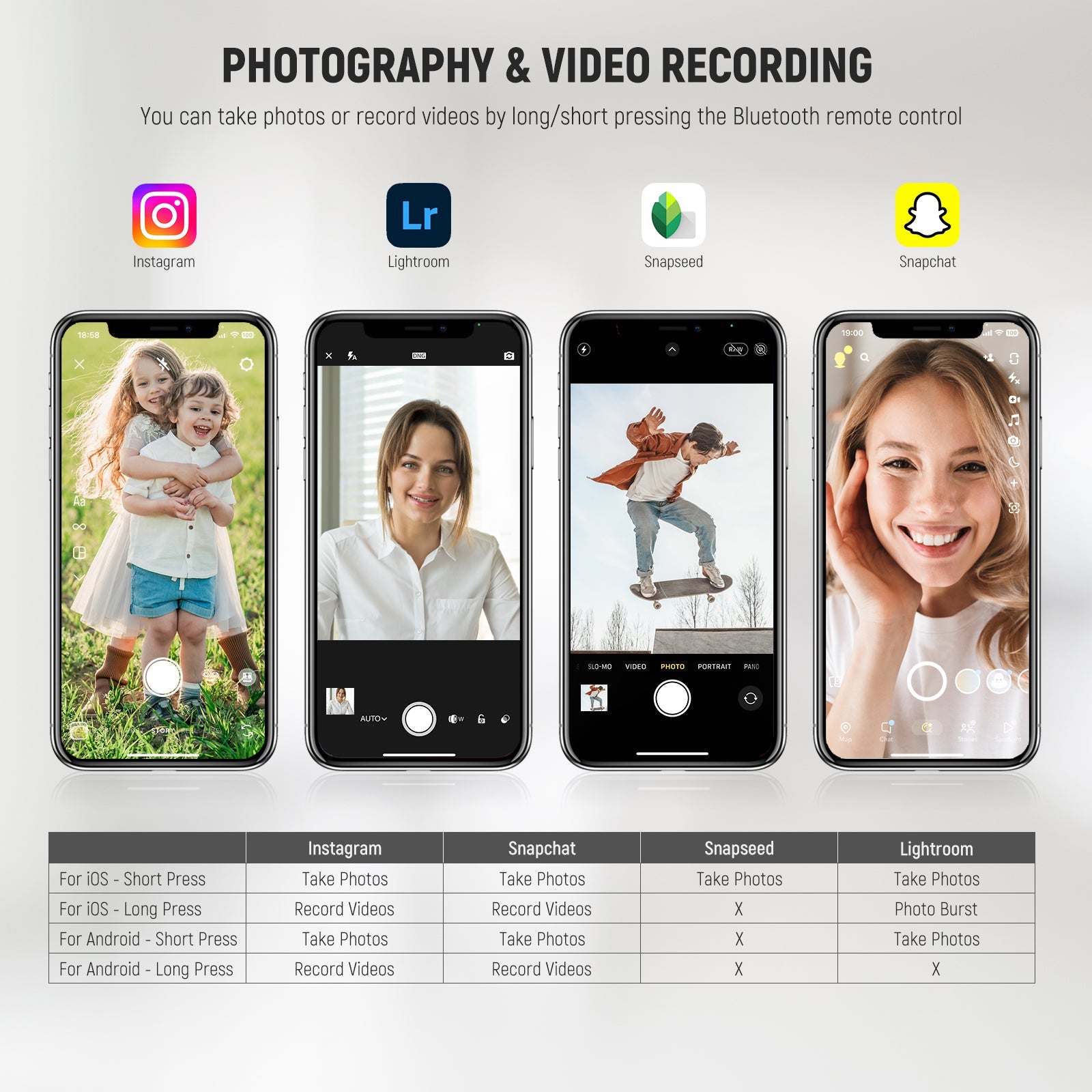 - Scatta selfie con 1 tocco - Associa questo scatto remoto al tuo smartphone o tablet iOS/Android tramite connessione Bluetooth per selfie, ritratti, video di YouTube e chiamate Zoom, il tutto con 1 tocco nel palmo della mano. Pressione breve per le foto, pressione lunga per i video