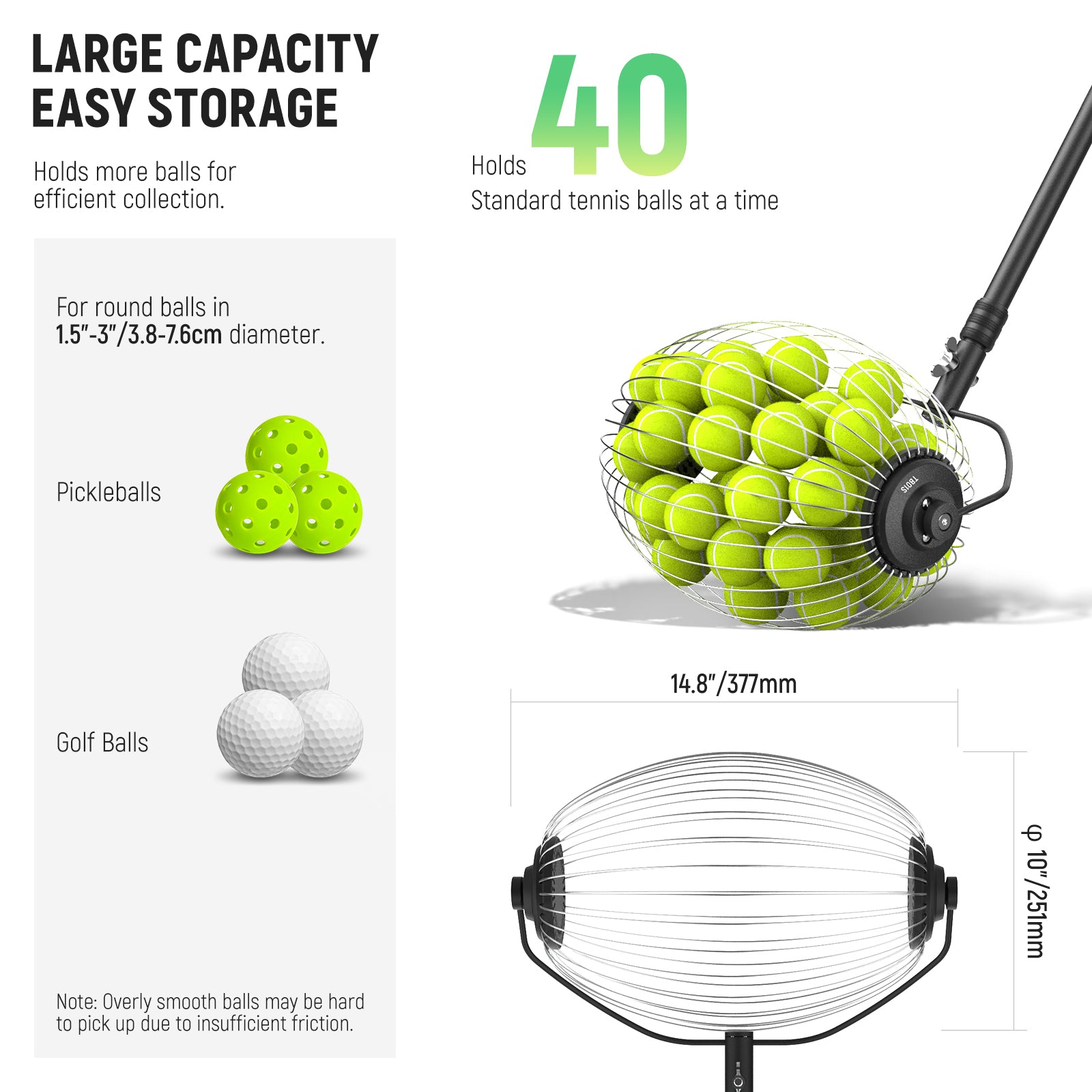 - Può contenere fino a 40 palline - Il raccoglitore a rulli misura φ9,8"xL15" (25x38 cm), offrendo ampio spazio per un massimo di 40 palline da tennis standard (da 2,4" a 2,7"/60-68 mm). I fili flessibili lo rendono adatto anche per raccogliere altre palline da 1,5" a 3" (3,8-7,6 cm), come quelle da pickleball e da golf. Per estrarre le palline, allargare manualmente i fili per farle uscire. Nota: NON utilizzare per oggetti troppo lisci.