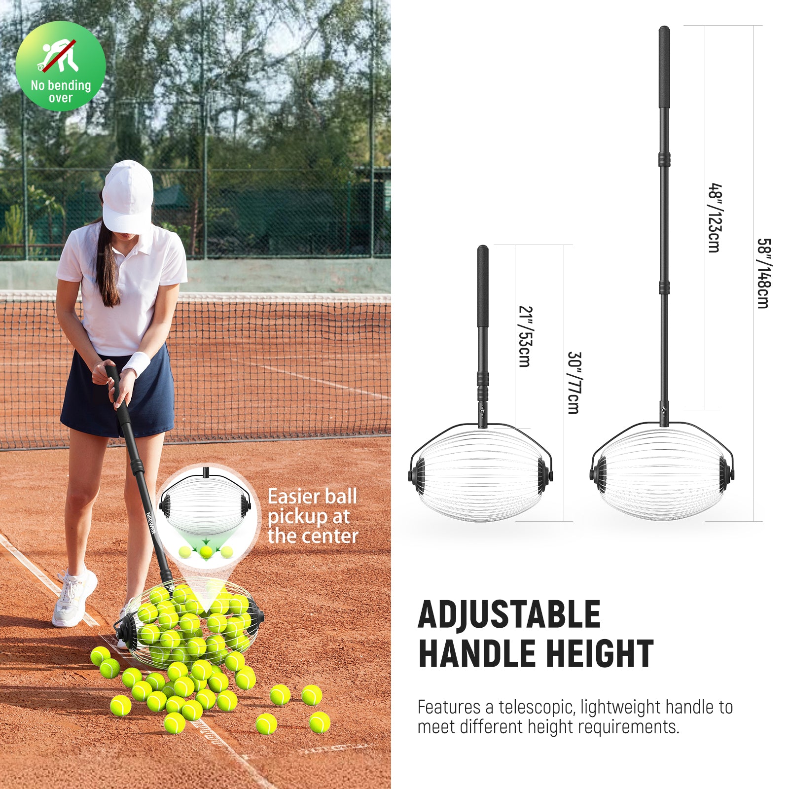 - Altezza regolabile per un comfort ottimale - Il manico telescopico consente di regolare l'altezza del raccogli-palline da tennis tra 77 e 148 cm per adattarsi a utenti di diverse altezze, con l'estremità rivestita in morbida schiuma antiscivolo per una presa comoda. Garantisce un'esperienza piacevole per tutti, risparmiando tempo ed evitando fastidi indesiderati, così puoi concentrarti maggiormente sul tuo allenamento.