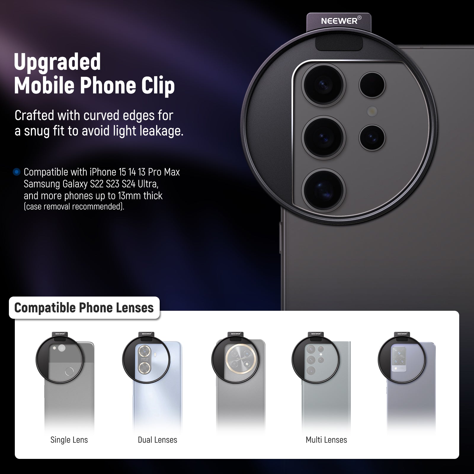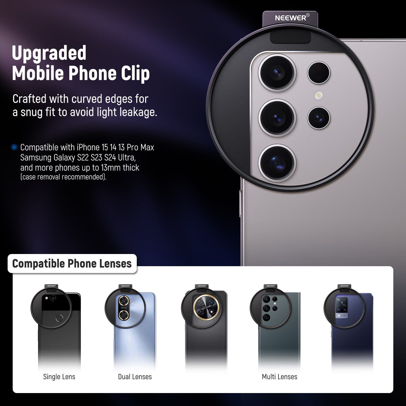 Gli obiettivi per telefono NEEWER sono utili per migliorare la fotocamera del tuo smartphone e migliorare la tua fotografia mobile. La nostra collezione include una varietà di obiettivi, come macro, teleobiettivo, microscopio e fisheye. Questi obiettivi sono perfetti per la fotografia di strada, di paesaggio, di architettura e di gruppo. Scegli obiettivi per fotocamera del telefono di alta qualità per catturare foto straordinarie.