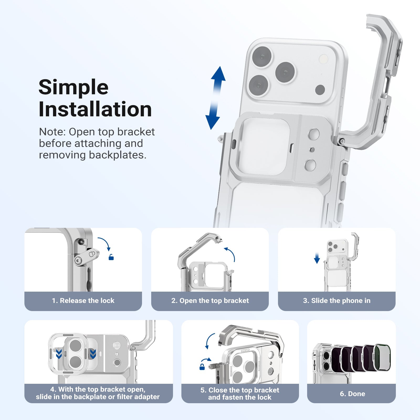 Custodie/gabbie per telefoni dedicate e universali, maniglie, controlli Bluetooth, carrelli, cursori, treppiedi e altri accessori per la fotografia mobile.
