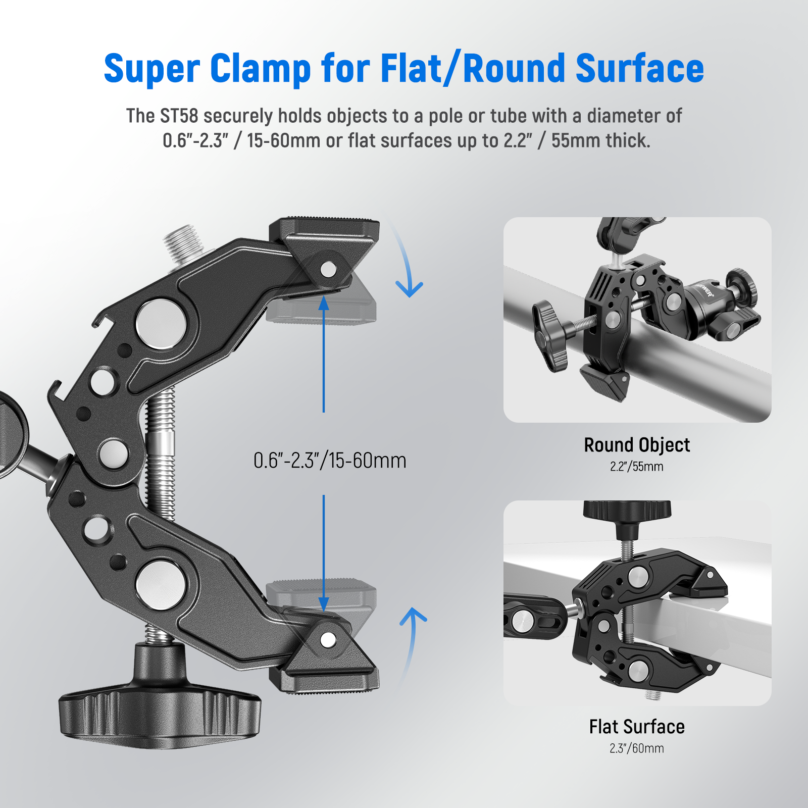 - Super Clamp per superfici piatte/rotonde - ST85 tiene saldamente gli oggetti al palo o al tubo con un diametro da 0,6"-2,3"/15-60 mm o superfici piatte fino a 2,2"/55 mm di spessore, ideale per gambe di treppiedi, selfie stick, supporti per luci, spallacci, supporto per manubrio per bicicletta. Compatibile con aste stabilizzatrici gimbal DJI Ronin-M Ronin MX Freefly Movi da 25 mm/30 mm. Imbottitura in gomma per stabilità e prevenzione dei graffi. La resistente struttura in lega di alluminio anodizzato nero garantisce una capacità di carico di 3,3 libbre/1,5 kg