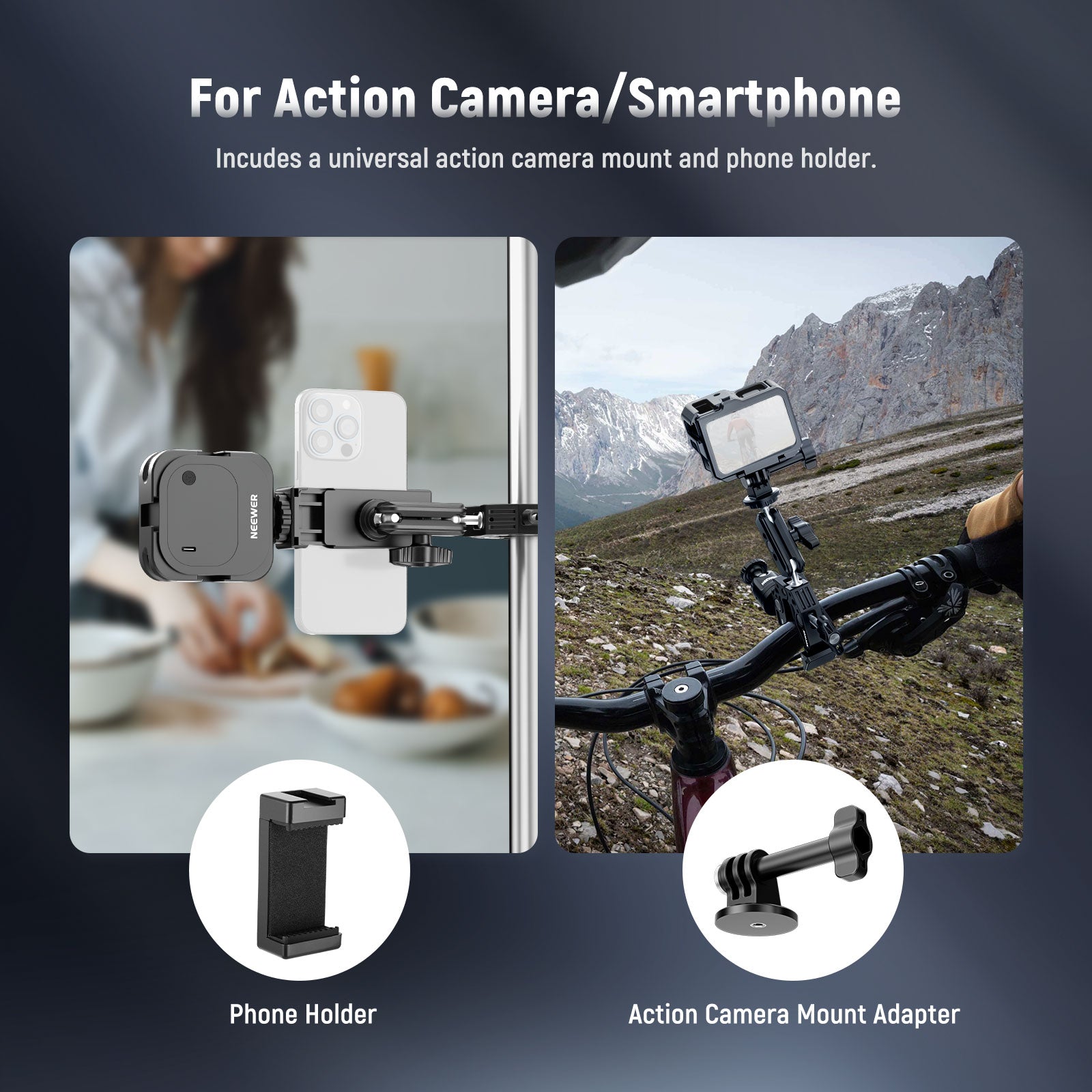 Per Action Camera/Smartphone - Il pacchetto include un adattatore universale per montaggio su action camera compatibile con GoPro Hero 12 11 11 mini 10 9 Max Insta360 ONE X3 X2 GO 3 GO 2 DJI Osmo Action 4 3 2, ecc. Un morsetto regolabile per telefono da 2"-3,3" (5-8,5 cm) è compatibile con iPhone 16 15 Pro Max 14 13 Pro Max 14 Plus 13 Mini 12 X Xs Max Samsung Galaxy S23 A22 Ultra Huawei P60 Pro Mate 60 Google Pixel 7 Pro e altre marche di smartphone sul mercato
