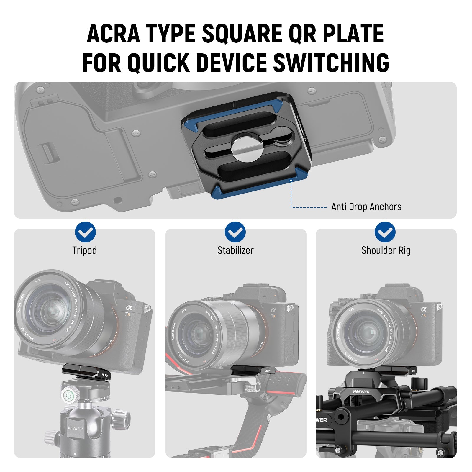 - Trasferimento senza soluzione di continuità tra spalla rig/treppiede/gimbal portatile - La piastra a sgancio rapido, con una linguetta di bloccaggio rapido laterale, è completamente compatibile con i gimbal Arca Swiss DJI RS 2 RSC 2 RS 3 Pro, consentendo trasferimenti senza soluzione di continuità tra spalla rig e uno stabilizzatore per telecamera portatile o testa fluida per treppiede tipo Arca testa a sfera. La piastra di base presenta anche una coda di rondine tipo Arca per il montaggio su treppiede, insieme a tre filettature da 1/4" e una filettatura da 3/8" per il collegamento ad altri treppiedi e attrezzature di supporto