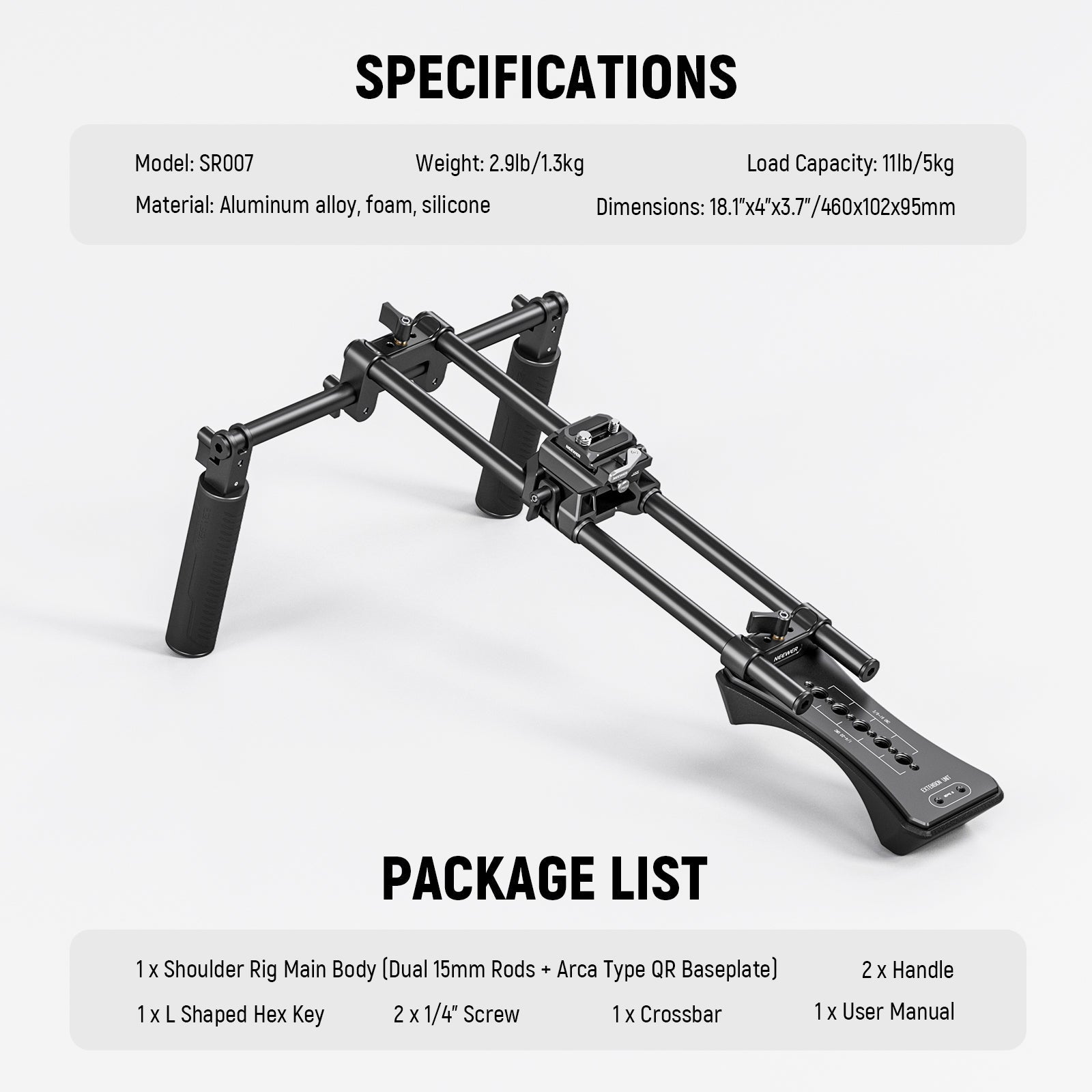 - 1 x corpo principale del Shoulder Rig (doppie aste da 15 mm + piastra di base Arca Type QR)