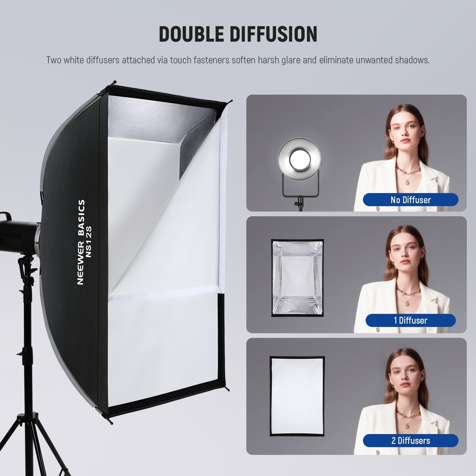 - Customizable Honeycomb Grid & Diffusers- For various shooting scenarios and photography styles—be it portrait, still life, filming, or live streaming, the soft box lighting set includes a honeycomb grid for more confined and directional light, and two diffusion panels attaching via touch fasteners to soften glare and eliminate shadows