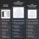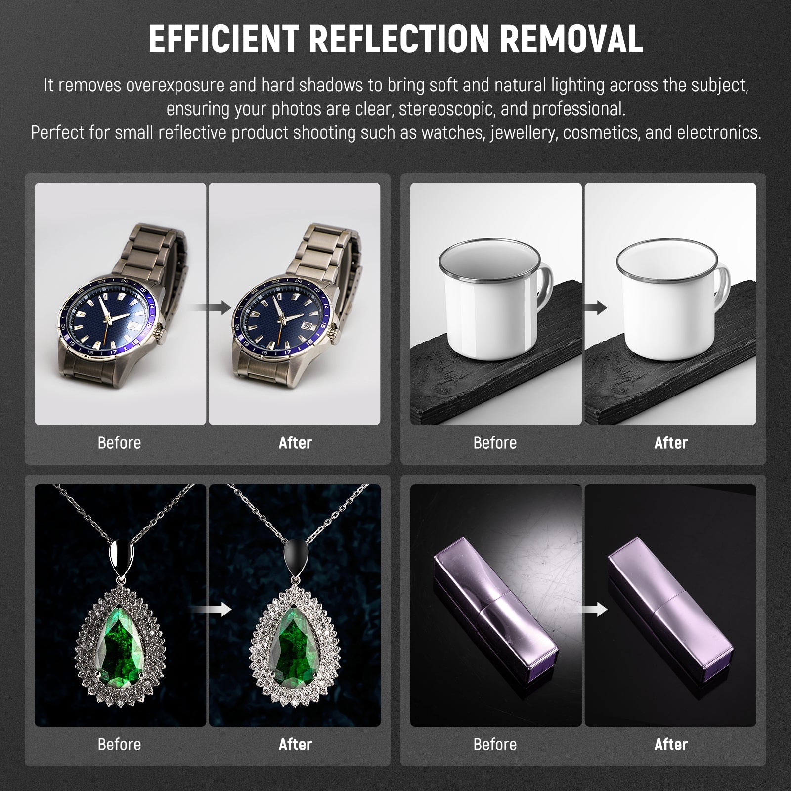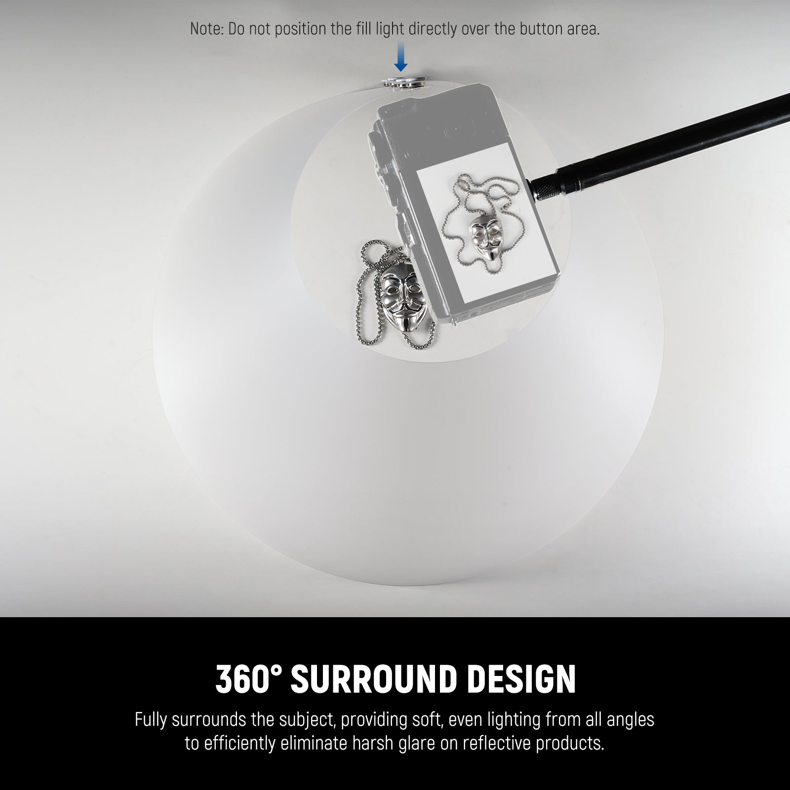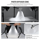 - Distribuzione della luce a 360° - I coni di luce diffondono uniformemente la luce intensa, eliminando le ombre e riducendo al minimo i riflessi sugli oggetti lucidi. L'apertura superiore inclinata consente un facile accesso alla fotocamera, perfetta per riprese dall'alto e riprese in piano.