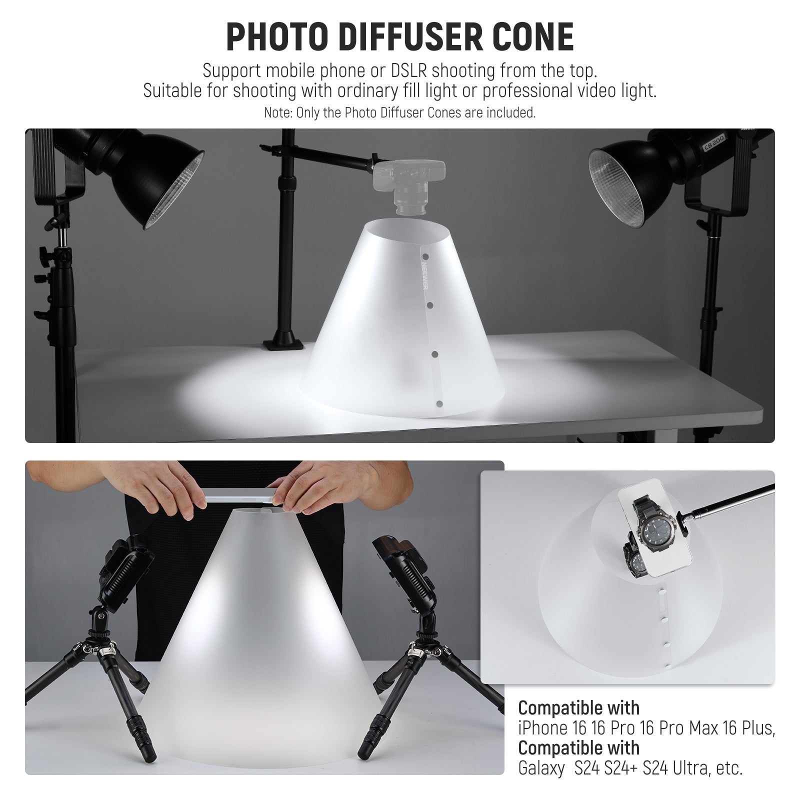 - Disponibile in tre misure : 14"/356 mm, 15"/381 mm e 20"/508 mm, questo kit cono di diffusione della luce è adatto a una varietà di soggetti come accessori, orologi, cosmetici, elettrodomestici e altri oggetti riflettenti e lucidi. Il cono più piccolo è compatibile con iPhone e Android per le riprese da smartphone. Ideale per i creatori di contenuti e gli influencer, è un accessorio indispensabile per la fotografia, la videografia e lo streaming.