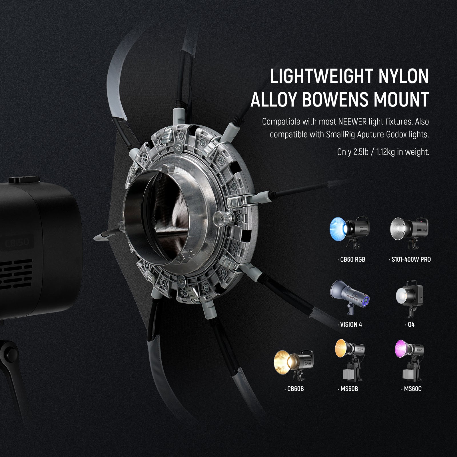 - Attacco Bowens standard - Con l'attacco Bowens standard, questo softbox può essere collegato a numerose monotorce e luci video continue e monotorce flash stroboscopiche NEEWER, come CB60, CB100, CB150, CB60B, RGB CB60, CB200B, MS60B, MS60C, MS150B, S101-300W/400W Pro, Vision 4, Q4. Compatibile con SmallRig compatibile con Aputure 120d Godox sl60w, ecc.