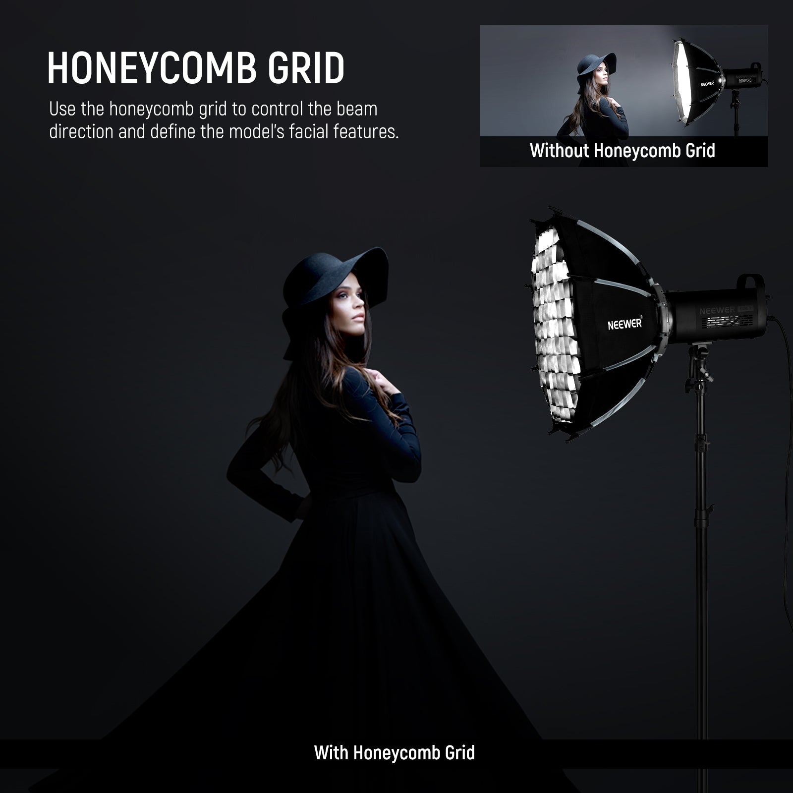 - Griglia a nido d'ape e diffusori - La griglia a nido d'ape può rendere la forma della luce confinata e direzionale, dando un effetto di luce drammatico ed espressivo per definire la struttura facciale del modello. Due diffusori di qualità possono essere combinati o utilizzati separatamente per effetti diversi
