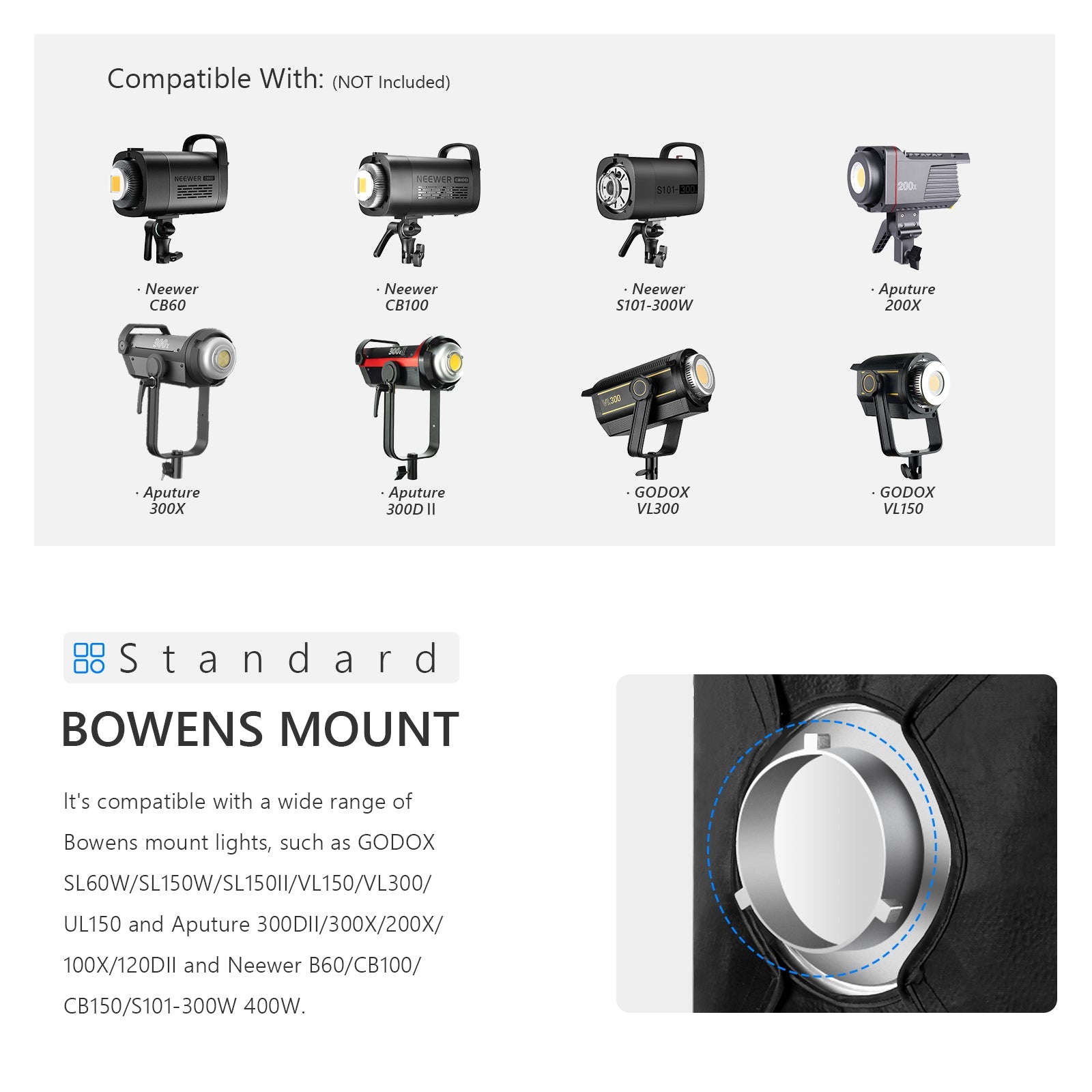 - Design con attacco Bowens : compatibile con monotorce, luci LED continue e altri dispositivi di illuminazione dotati di attacco Bowens, tra cui NEEWER SL70, CB60, CB100, CB150, Vision 4, Vision 5, S101-300W, S101-400W e altri