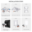 - Montaggio senza sforzo - L'impostazione del softbox è piuttosto semplice. Apri il softbox e coprilo sull'anello di velocità del supporto Bowen con chiusure a strappo. Inserisci un'estremità dell'asta di metallo in una linguetta angolare del softbox e l'altra estremità in un foro sull'anello di velocità. Ripeti questo passaggio con il resto delle 3 aste di metallo