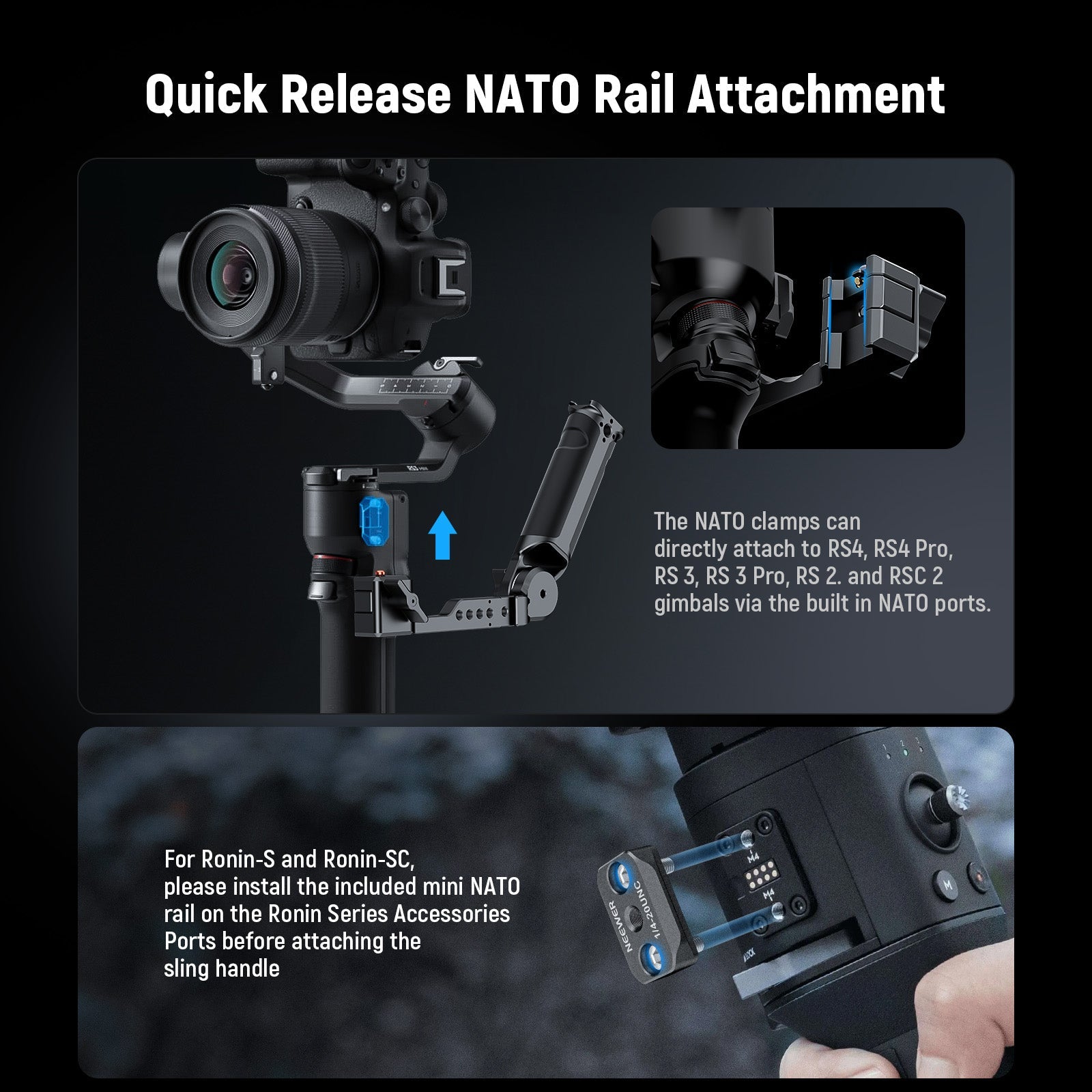 - Attacco rapido NATO Rail - Il morsetto NATO può essere attaccato direttamente a RS4, RS4 Pro, RS3, RS3 Pro, RS2 e RSC2 tramite porte NATO integrate. Per Ronin-S e Ronin-SC, installare la mini guida NATO inclusa sulle porte accessorie della serie Ronin, quindi attaccare la maniglia della tracolla
