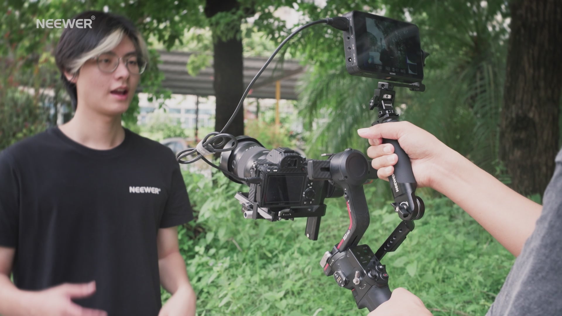 - Punti di montaggio multipli per accessori : filettature da 1/4", filettature da 3/8" con fori di posizionamento ARRI e cold shoe possono collegare diversi accessori per una migliore qualità video. Questi accessori includevano il microfono CM14 Pro, la luce video LED PL81, il braccio magico ST25, il supporto per monitor MA006 e il monitor da campo F500
