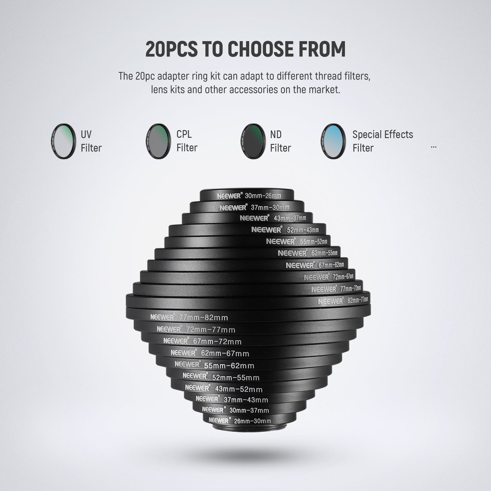 NEEWER Kit Anello Adattatore Filtro Lente in Metallo Nero Anodizzato da 20 Pezzi