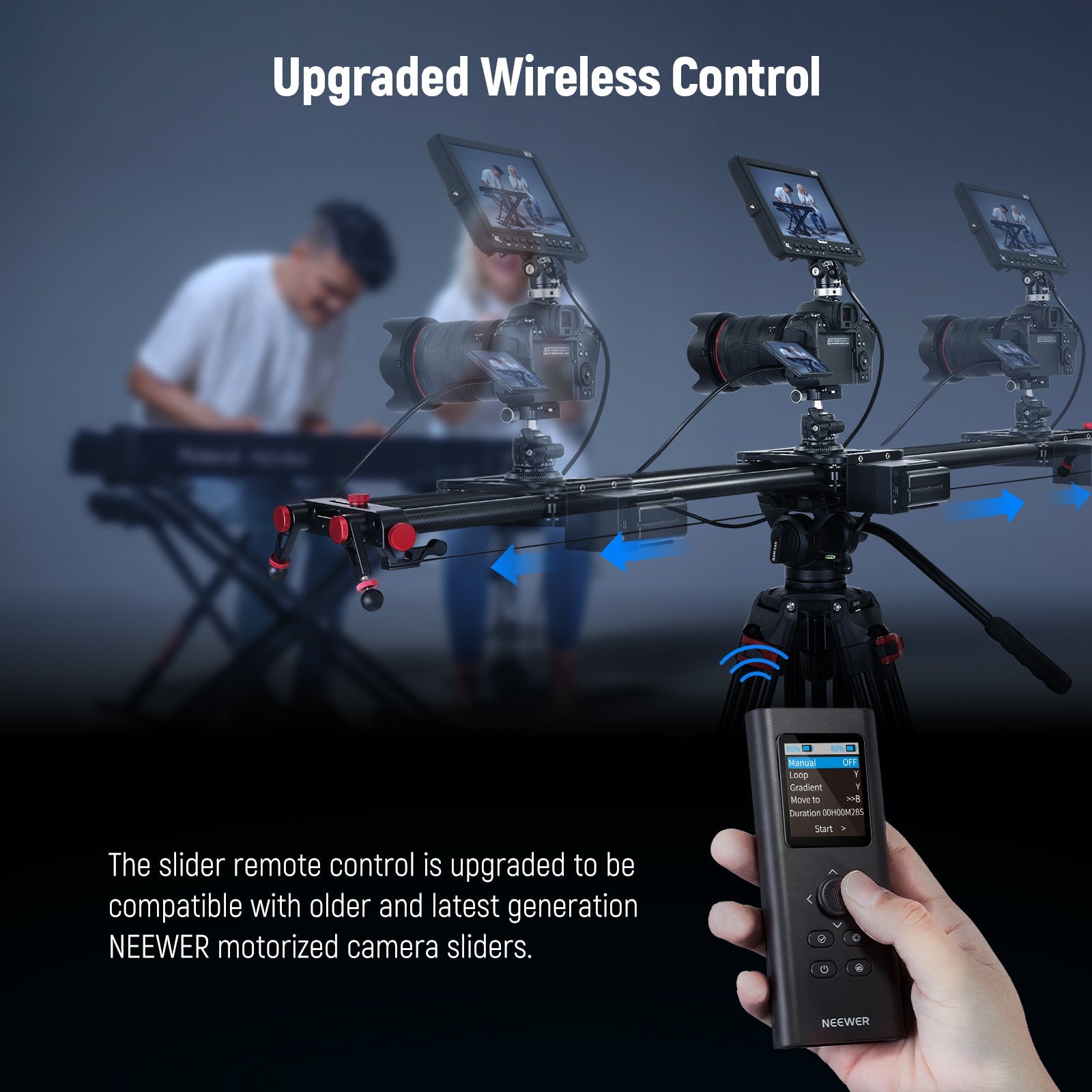 - Controllo wireless aggiornato - Il telecomando dello slider è stato aggiornato per essere compatibile sia con la vecchia generazione che con la nuova generazione di slider per fotocamera motorizzata NEEWER, incluso lo slider per fotocamera motorizzato VS-80WC/VS-100WC 2.4G e lo slider motorizzato controllato da app della serie ER1 (ER1-120, ER1-100 e ER1-80). Acquistane uno adesso da abbinare al tuo slider NEEWER per ottenere un facile controllo