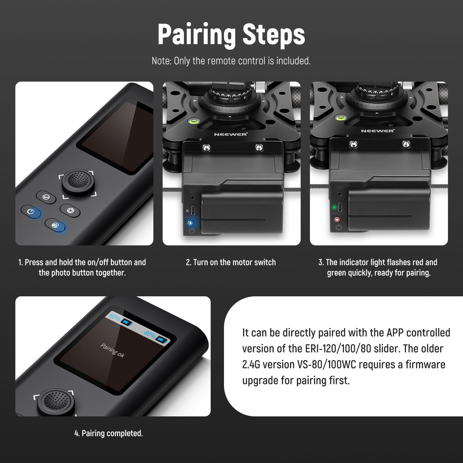 - Passaggi di accoppiamento: senza richiedere un aggiornamento del firmware, la linea di scorrimento controllata dall'app (ER1-120, ER1-100 ed ER1-80) e la nuova generazione di slider di controllo 2.4G VS-80WC/VS-100WC possono essere accoppiati con il telecomando seguendo questi passaggi: 1. Premere a lungo il tasto On/Off e il tasto della fotocamera; 2. Accendere l'interruttore del motore; 3. La spia lampeggia rapidamente in rosso e verde; 4. L'associazione è completata