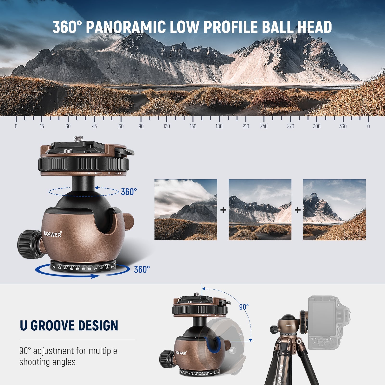- Testa a sfera a basso profilo - Completamente compatibile con i treppiedi NEEWER LITETRIP, la testa a sfera a basso profilo φ40mm riduce la sua gravità per una maggiore stabilità e supporta un carico fino a 22lb/10kg, e consente una maggiore flessibilità per angoli e prospettive unici. Con un foro filettato inferiore da 3/8", il supporto per testa a sfera può anche essere attaccato ad altri treppiedi, monopiedi, cursori, ecc.