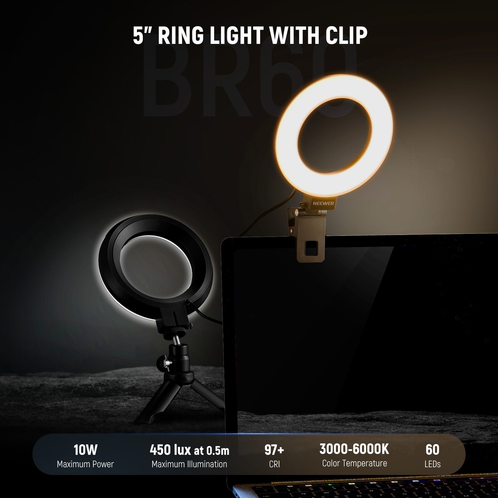 - Luce di riempimento LED versatile con clip - Dotata di 60 LED, la luce ad anello NEEWER BR60 offre fino a 450Lx di illuminazione a 0,5 m, temperatura di colore 3000K-6000K e CRI>97. La luce a clip può essere montata su smartphone, laptop, computer, display desktop e monitor con uno spessore inferiore a 1"/2,5 cm e include un mini treppiede per un utilizzo versatile nel trucco, selfie, registrazione video Tiktok/Youtube, Facetime, chiamate Zoom, videoconferenze, streaming live, vlogging, ecc.