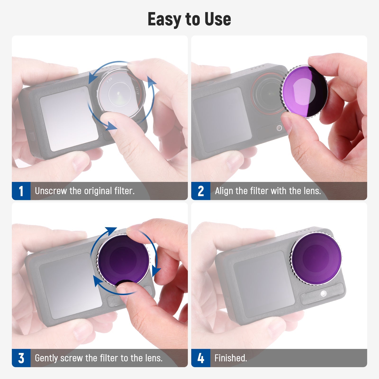 - Per Osmo Action 5 Pro e 4 - Compatibile con l'attrezzatura DJI Osmo Action 5 Pro e l'attrezzatura Action 4 (Action 4 Adventure Vlog Combos), questo kit di accessori fotografici con filtro per obiettivo ND (densità neutra) è perfetto per riprese POV di surf, snorkeling, kayak, sci, mountain bike, paracadutismo, skateboard e altri sport