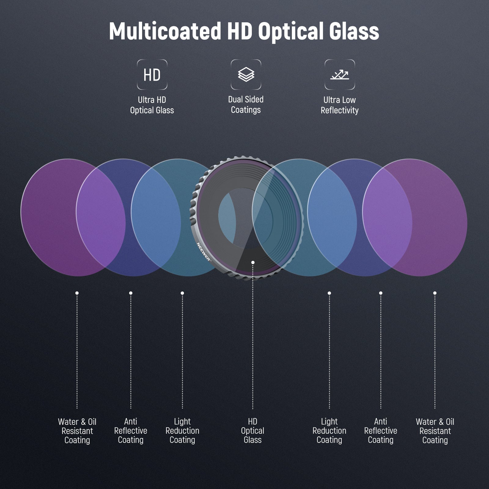 - Telaio in lega di alluminio elegante : ogni filtro pesa solo 0,15 oz/4,3 g ed è dotato di un telaio sottile in lega di alluminio con lavorazione di precisione CNC per garantire durata e affidabilità, come elemento essenziale per i creatori di contenuti e gli influencer.