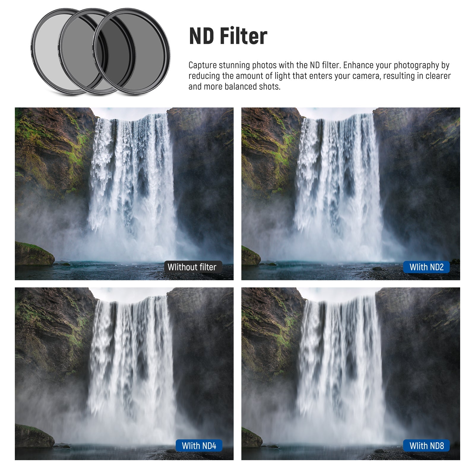- Esposizione bilanciata con filtri ND : i filtri a densità neutra riducono la quantità di luce che entra nel sensore della fotocamera di vari gradi, ND2 di 1 stop, ND4 di 2 stop e ND8 di 3 stop, per ottenere un'esposizione bilanciata tra le immagini in diverse condizioni di luce. Questi filtri ND rendono possibili anche scatti a lunga esposizione rallentando la velocità dell'otturatore