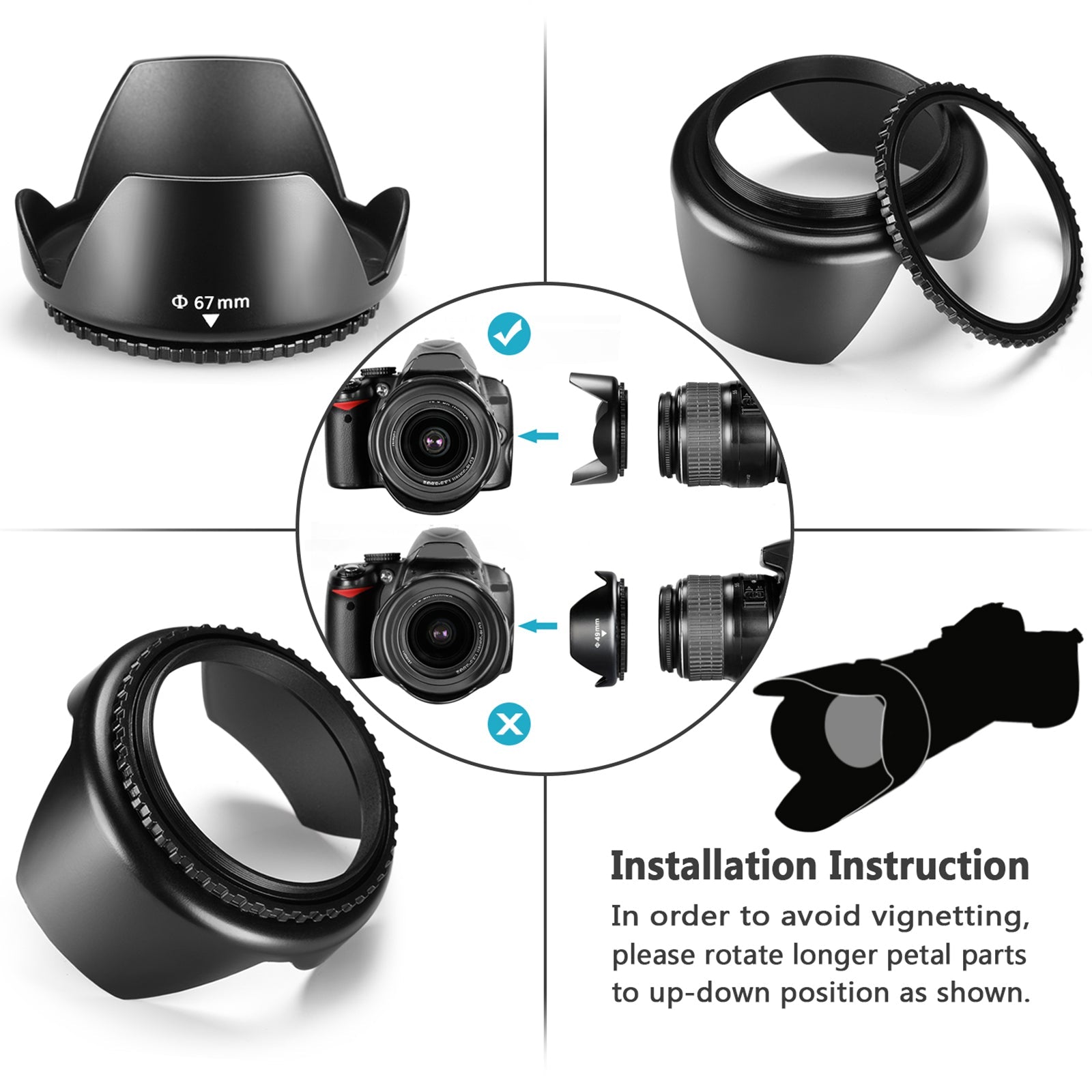 - Due paraluce forniti : un paraluce a forma di tulipano e un paraluce in gomma pieghevole aiutano a bloccare l'eccessiva luce solare e a ridurre i riflessi e i bagliori. Il paraluce pieghevole in gomma può essere piegato in tre forme, tulipano, fiore e pedale, per una maggiore versatilità. Il paraluce a tulipano è adatto per obiettivi grandangolari poiché non provoca vignettatura