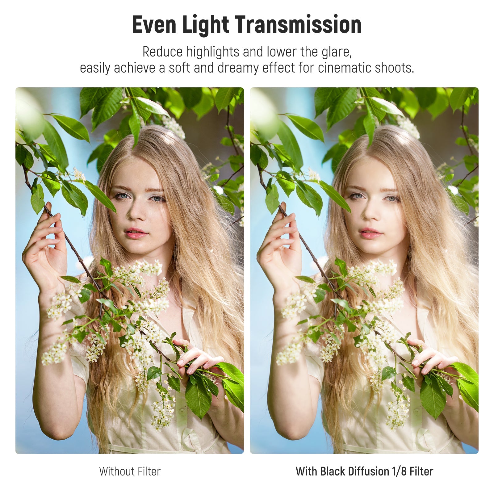 - Filtro per obiettivo della fotocamera a diffusione nera - Il filtro a diffusione nera 1/8 di NEEWER con effetti cinematografici sognanti aiuta a ridurre le alte luci e ad abbassare i riflessi, rendendo la pelle più liscia e morbida, ideale per ritratti, registrazioni video e video vlog