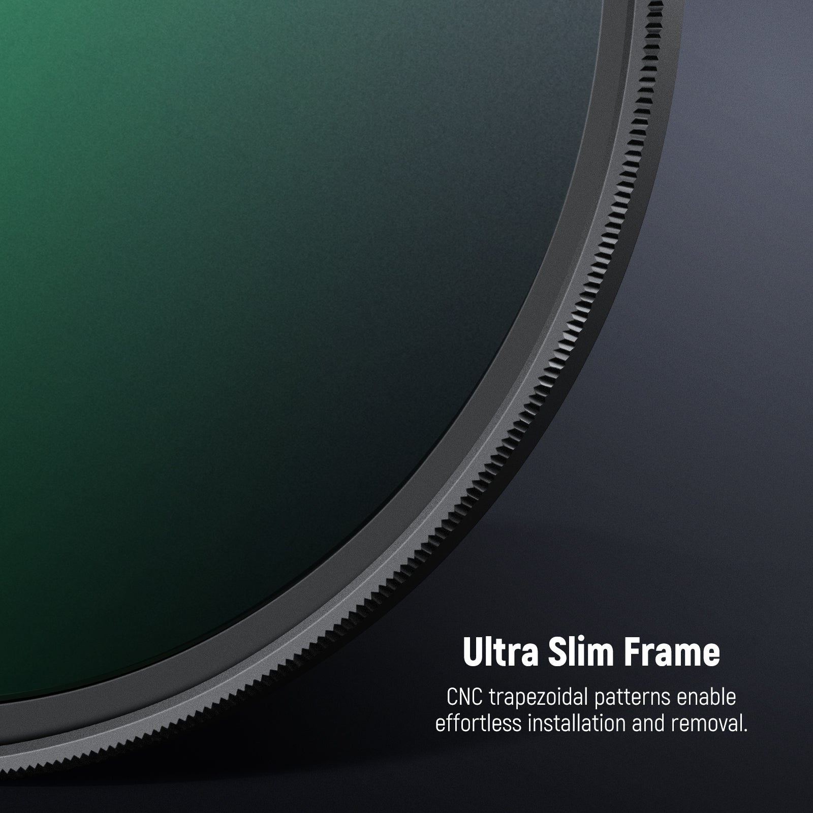 - Telaio antiscivolo e ultra sottile : il telaio ultra sottile evita la vignettatura e gli angoli scuri su obiettivi grandangolari e teleobiettivi. I modelli trapezoidali CNC consentono un'installazione e una rimozione senza sforzo