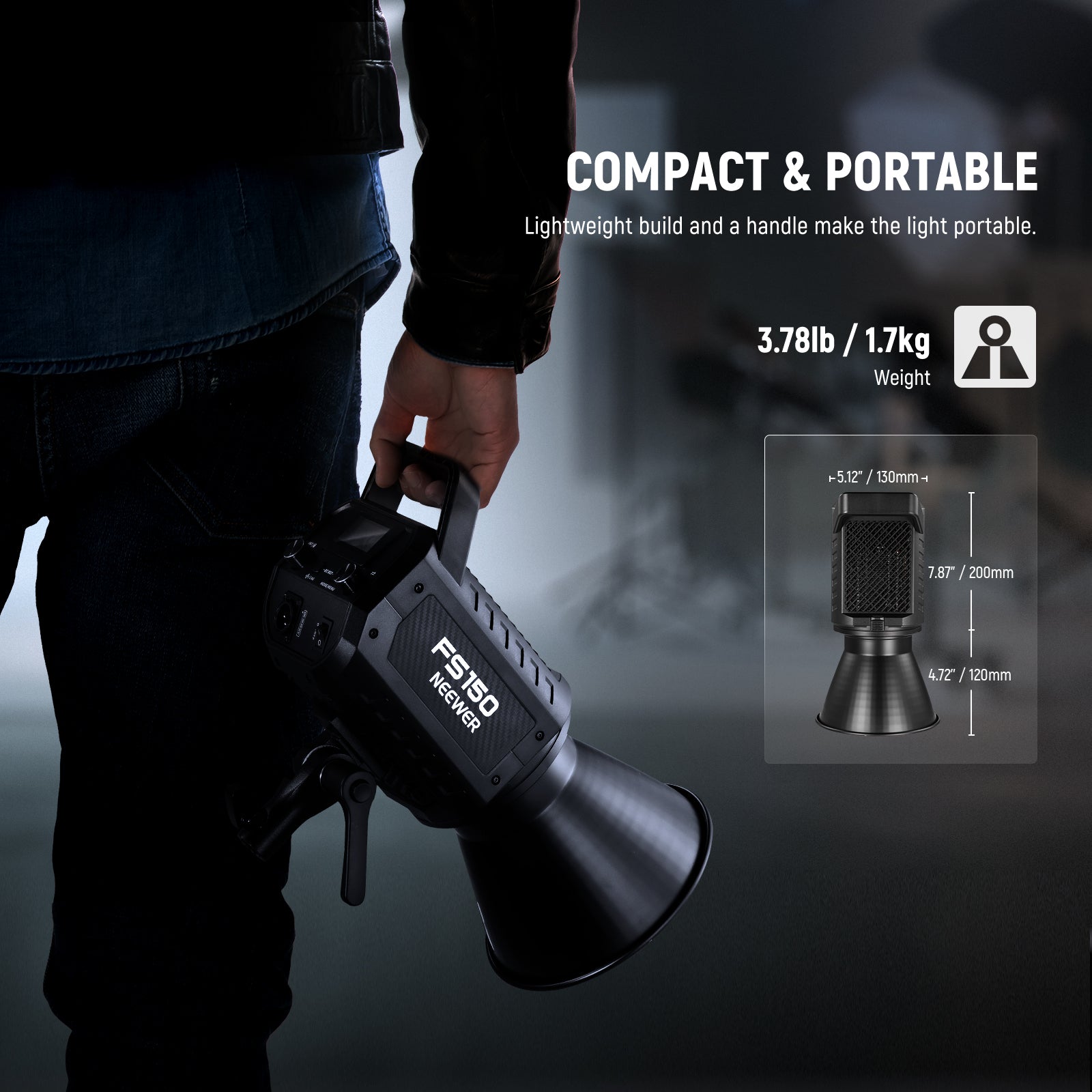 - Luce da studio compatta e potente da 130 W - NEEWER FS150 Video Lighting utilizza LED COB di alta qualità e altamente efficienti per una luminosità eccezionale, potenza in uscita di 130 W senza sfarfallio e un'illuminazione massima di 102000 lux/m. Il faretto portatile pesa solo 3,8 libbre (1,7 kg) e misura 7,9"x5,1" x 4,7" (200x130x120 mm), con un adattatore di montaggio con supporto inclinabile a 180° per configurazioni ad angolo libero, ideale per l'illuminazione di ritratti, interviste, registrazione video di YouTube/TikTok, riprese, streaming live e produzione in studio