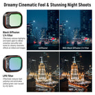- Sensazione cinematografica da sogno e riprese notturne straordinarie : il filtro a diffusione nera da 1/4 con un effetto cinematografico da sogno riduce le luci e abbassa l'abbagliamento per un aspetto più nebuloso e morbido, rendendolo ideale per ritratti, video e vlog. Il filtro di riduzione dell'inquinamento luminoso riduce la tonalità gialla prodotta dalle luci della città, consentendoti di catturare i dettagli del soggetto mantenendo i contrasti appropriati e prevenendo la sovraesposizione