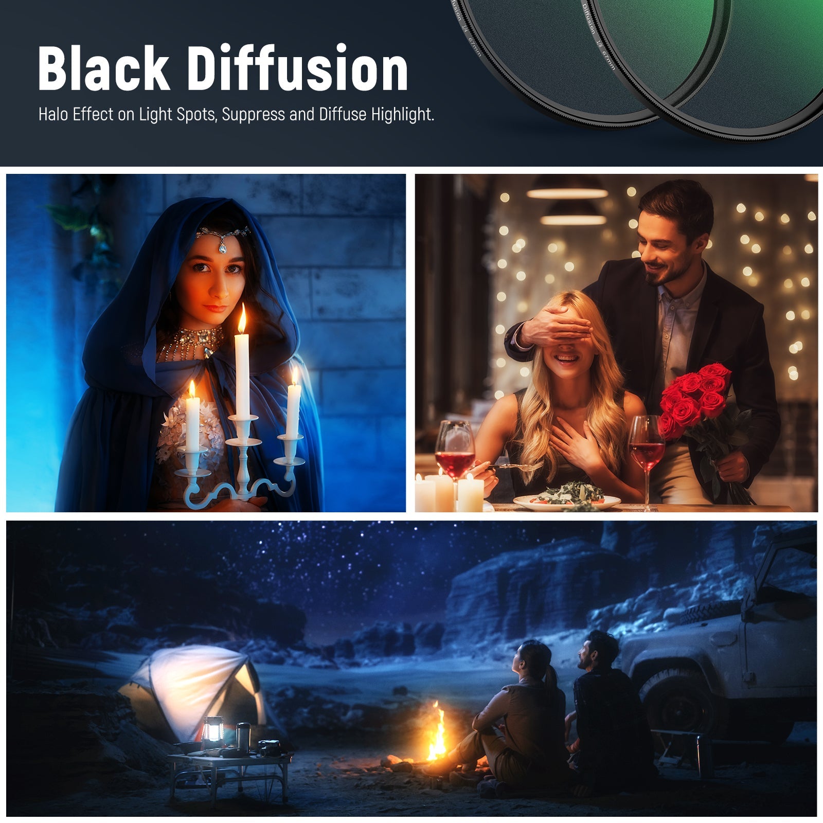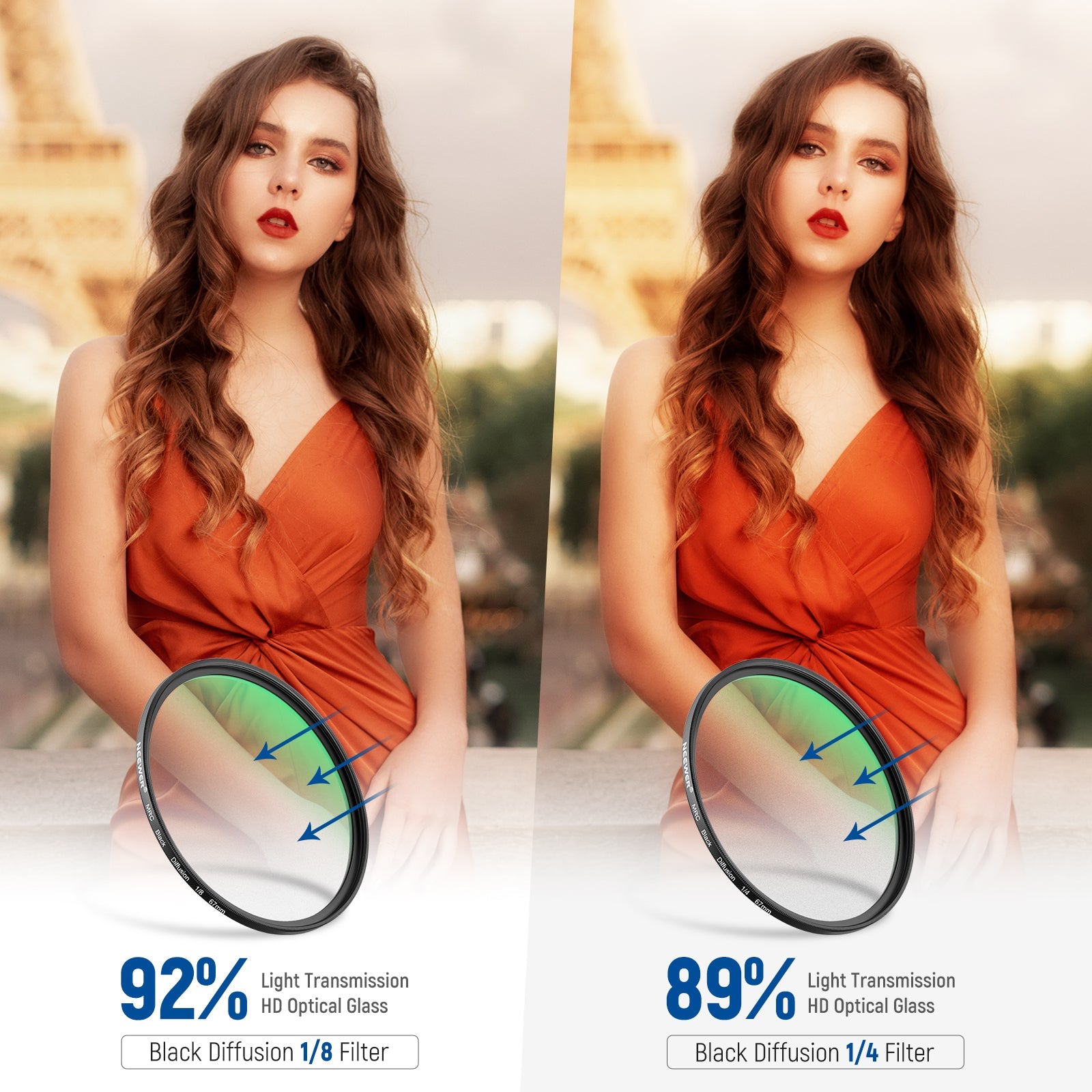 - Modello: 49/55/58/67/77/82 mm Filtro Black Diffusion 1/8 e filtro 1/4
