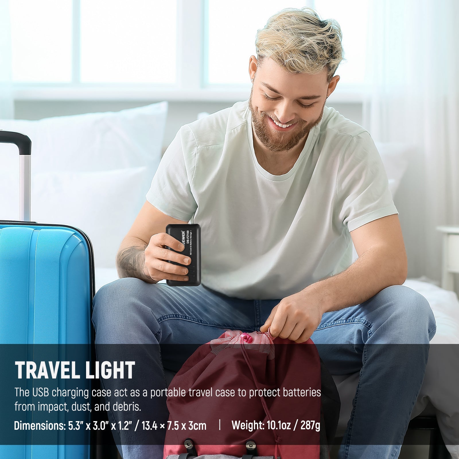 - Custodia di ricarica versatile : non solo un caricabatterie. La custodia di ricarica USB può caricare contemporaneamente due batterie e fungere da custodia da viaggio portatile per proteggerle da urti, polvere e detriti. Dispone inoltre di due alloggiamenti per schede SD e funziona come caricabatterie portatile per smartphone quando le batterie sono installate al suo interno.