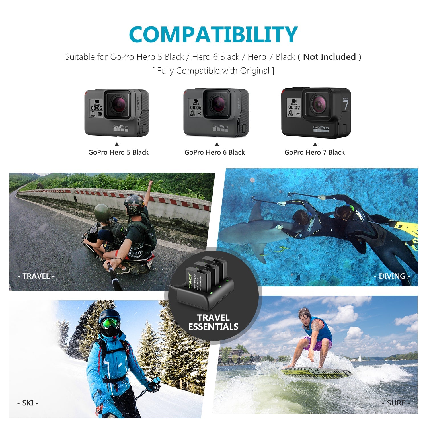 - ESATTAMENTE COME L'ORIGINALE : compatibile con la fotocamera GoPro Hero 5/6/7 Black, GoPro Hero 2018, ma la maggiore capacità della batteria da 1500 mAh può essere caricata all'interno della fotocamera o utilizzando il caricatore con ingresso USB per massimizzare l'efficienza di ricarica; Nessun effetto memoria, quindi puoi caricare la batteria in qualsiasi momento - Registrazione molto lunga