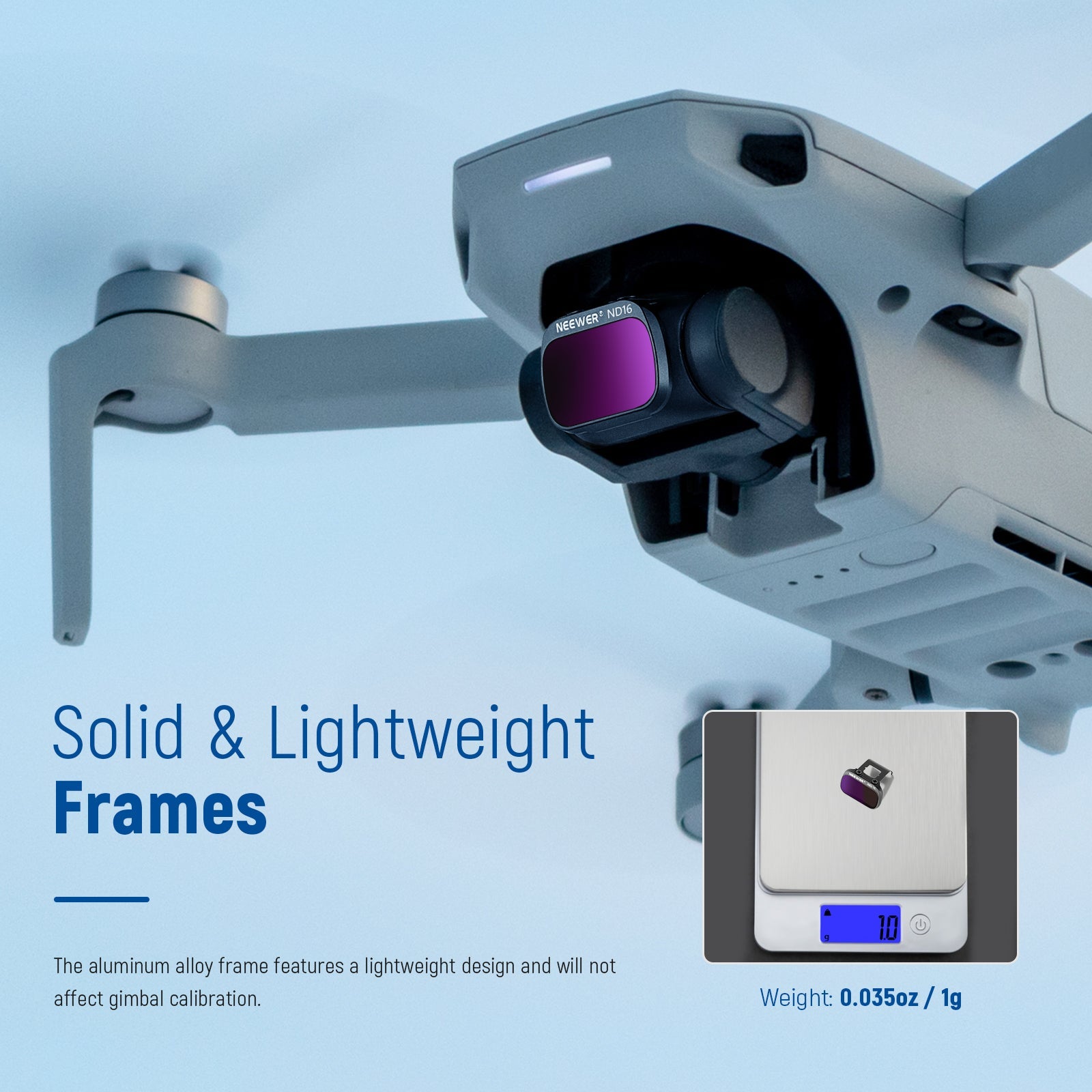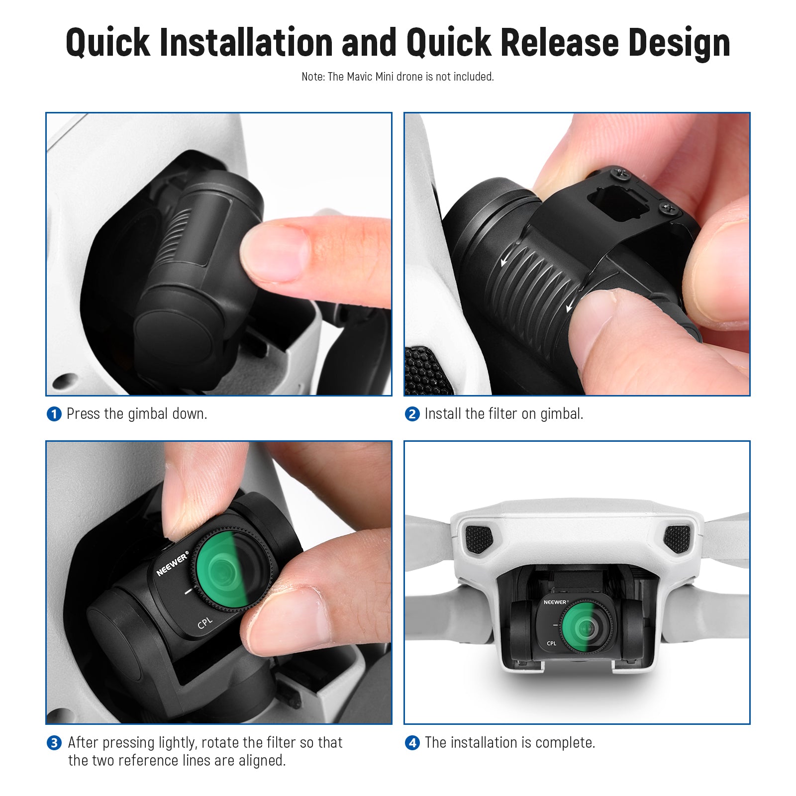 - Installazione leggera e rapida: ciascuno pesa solo 0,76-0,8 g e non influirà negativamente sul gimbal del drone. Il telaio in lega di alluminio con disegno ad attrito migliorato è facile da installare e rimuovere il filtro e si adatta perfettamente all'obiettivo, che non si allenta facilmente, senza danneggiare la qualità dell'immagine. (nota: non sono sicuro se quest'ultima parte debba essere lasciata o rimossa)