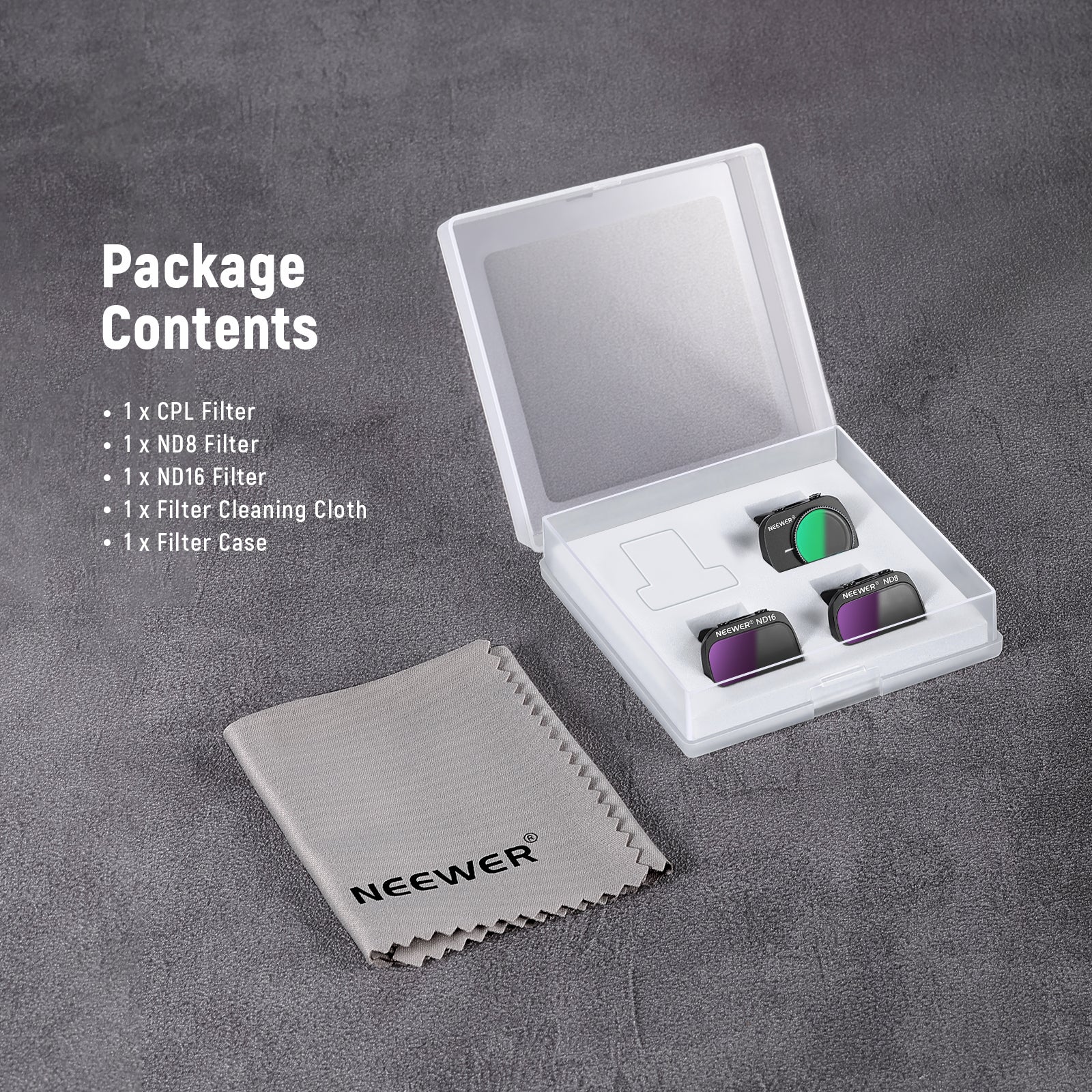 - Compatibile con Mavic Mini/Mini 2/Mini SE- Il set di filtri per obiettivi NEEWER ND8+ND16+CPL da 3 pacchi è progettato specificamente per la fotocamera DJI Mavic Mini/Mavic Mini 2/Mini SE. Porta questo kit con te ovunque tu vada nella comoda custodia da viaggio fornita. Nella confezione sono inclusi anche 3 filtri e un panno per la pulizia dei filtri
