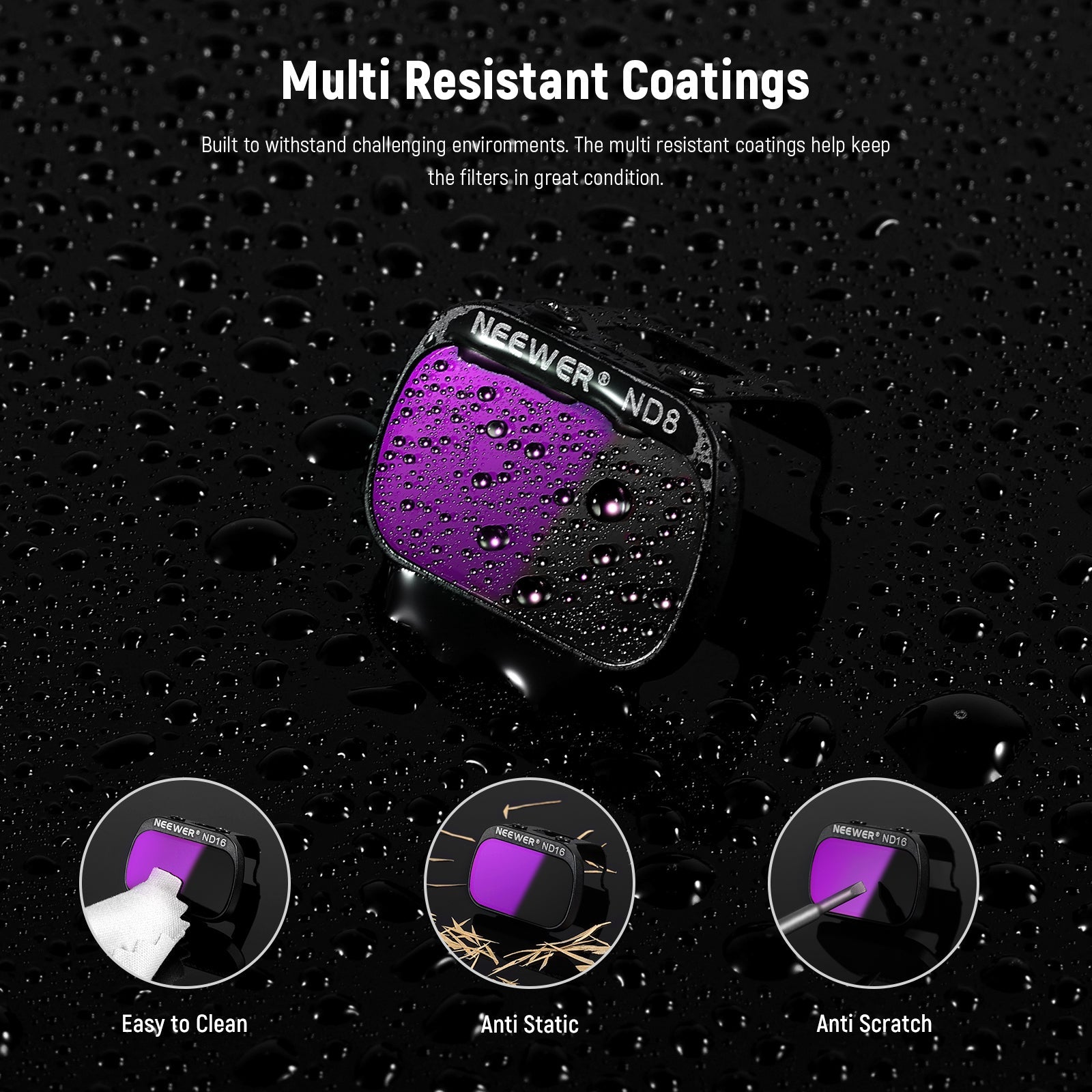 - Filtri ND8 e ND16 : i filtri ND sono progettati per ridurre la quantità di luce in entrata e catturare il tempo di esposizione o il movimento sfocato degli oggetti. ND8 riduce la velocità dell'otturatore della fotocamera di 3 stop e puoi utilizzarlo nelle giornate parzialmente nuvolose. Il filtro ND16 aiuta a ridurre la velocità dell'otturatore di 4 stop e può essere utilizzato a mezzogiorno/luce solare media.