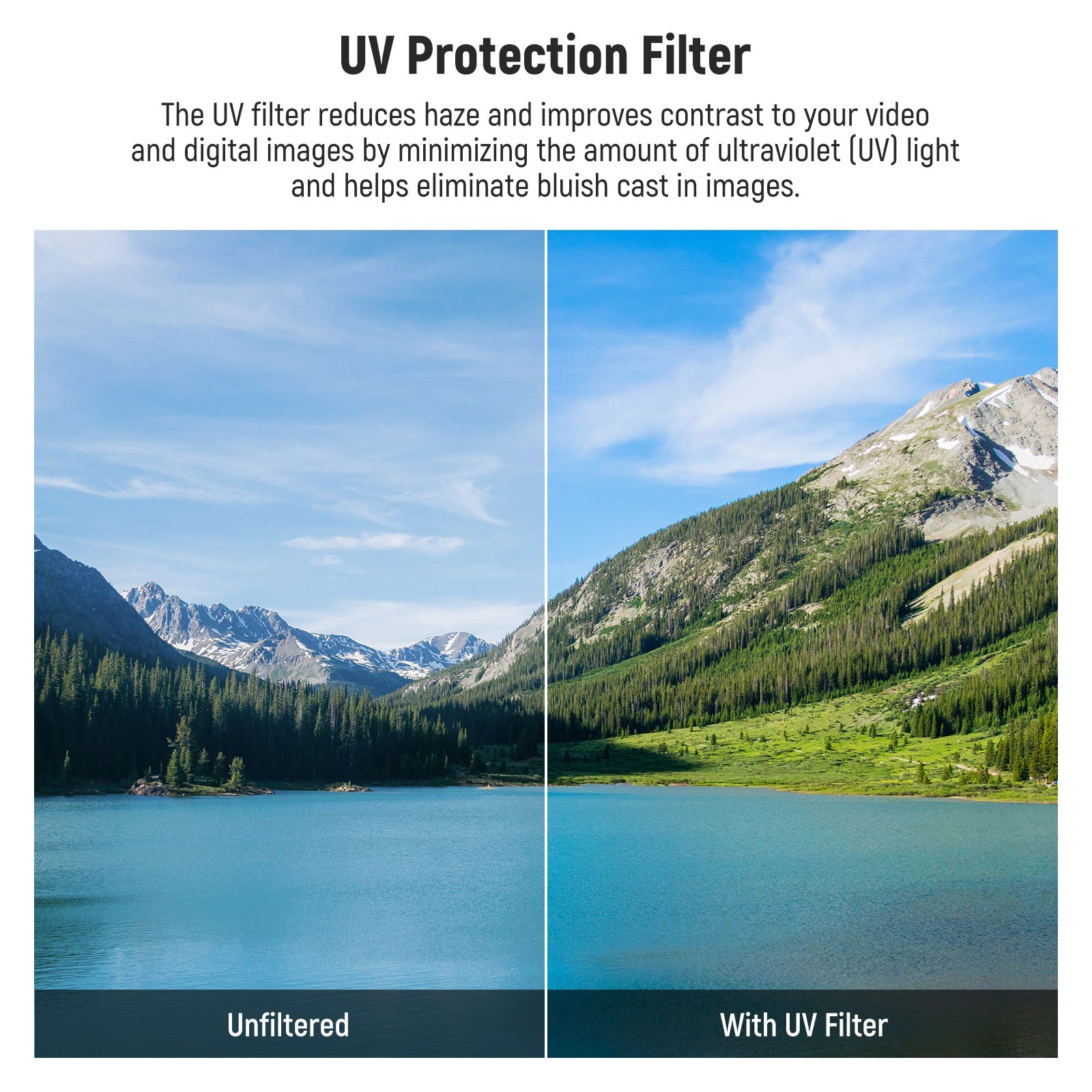 - Filtro UV protettivo : questo filtro UV riduce la foschia e minimizza i raggi ultravioletti (UV) migliorando il contrasto. Perfetto per scattare foto ad alta quota e sulla neve senza la dominante bluastra. Tieni questo filtro sull'obiettivo per proteggerlo da polvere, graffi e urti