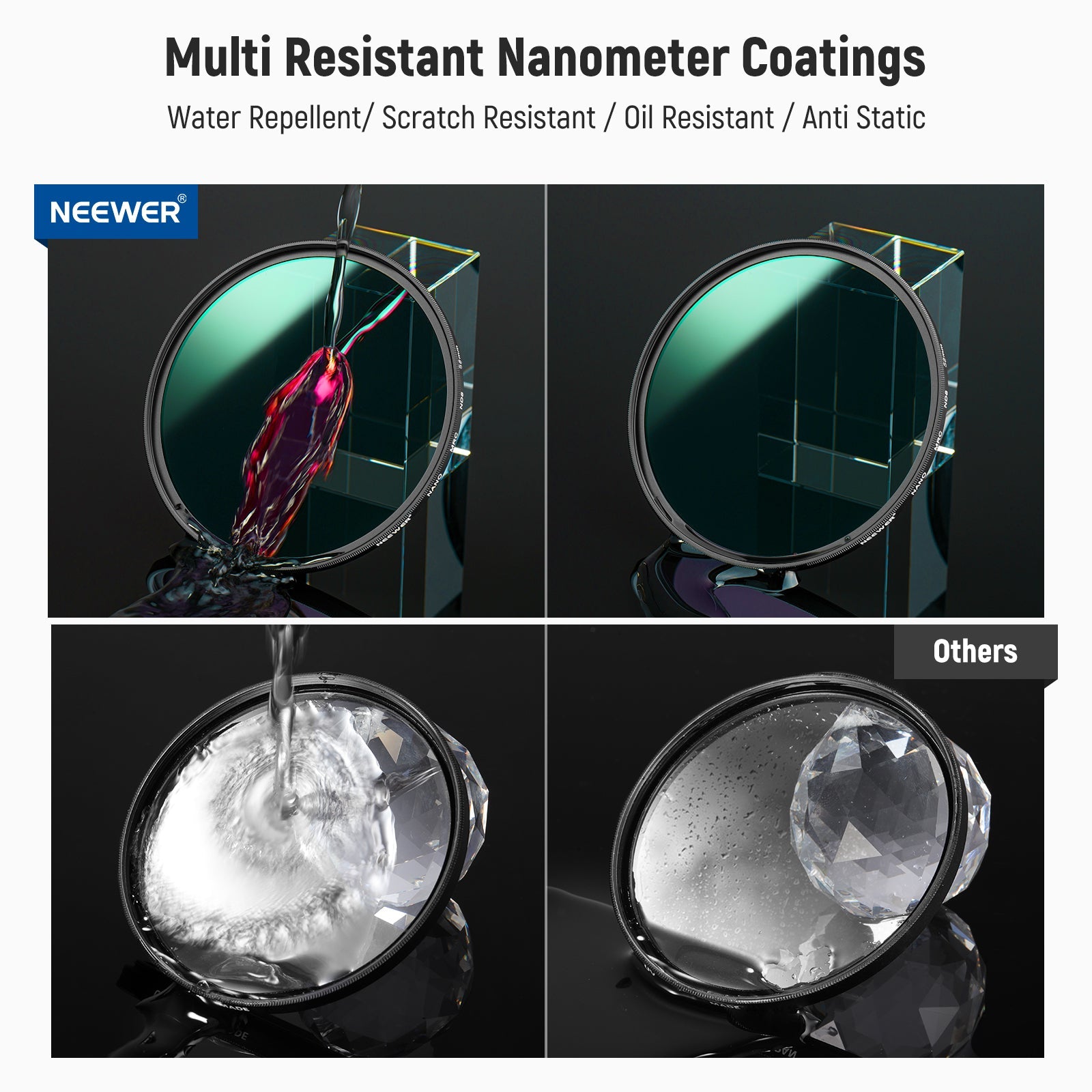- Vetro ottico HD con nanorivestimenti multiresistenti : con vetro ottico HD di alta qualità e 30 strati di nanorivestimenti su entrambi i lati dei filtri, la riflettività può raggiungere meno dello 0,1% per ridurre bagliori e immagini fantasma. Proteggere il filtro da acqua, olio, polvere e graffi
