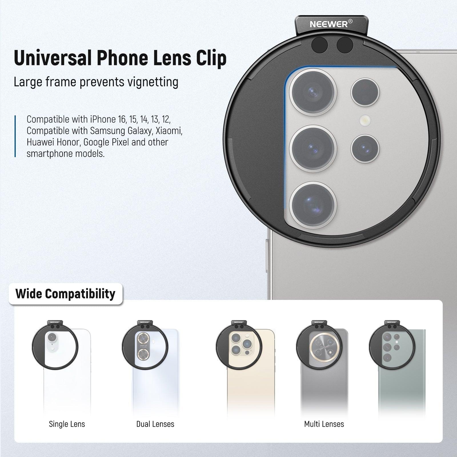 Clip universale per obiettivo del telefono : si fissa saldamente alla maggior parte degli smartphone con cuscinetti antigraffio. Compatibile con iPhone 17 Pro Max 16 Plus 16e 15 14 13 mini 12 Android Samsung Galaxy S24 S25 Ultra e altri modelli di smartphone.