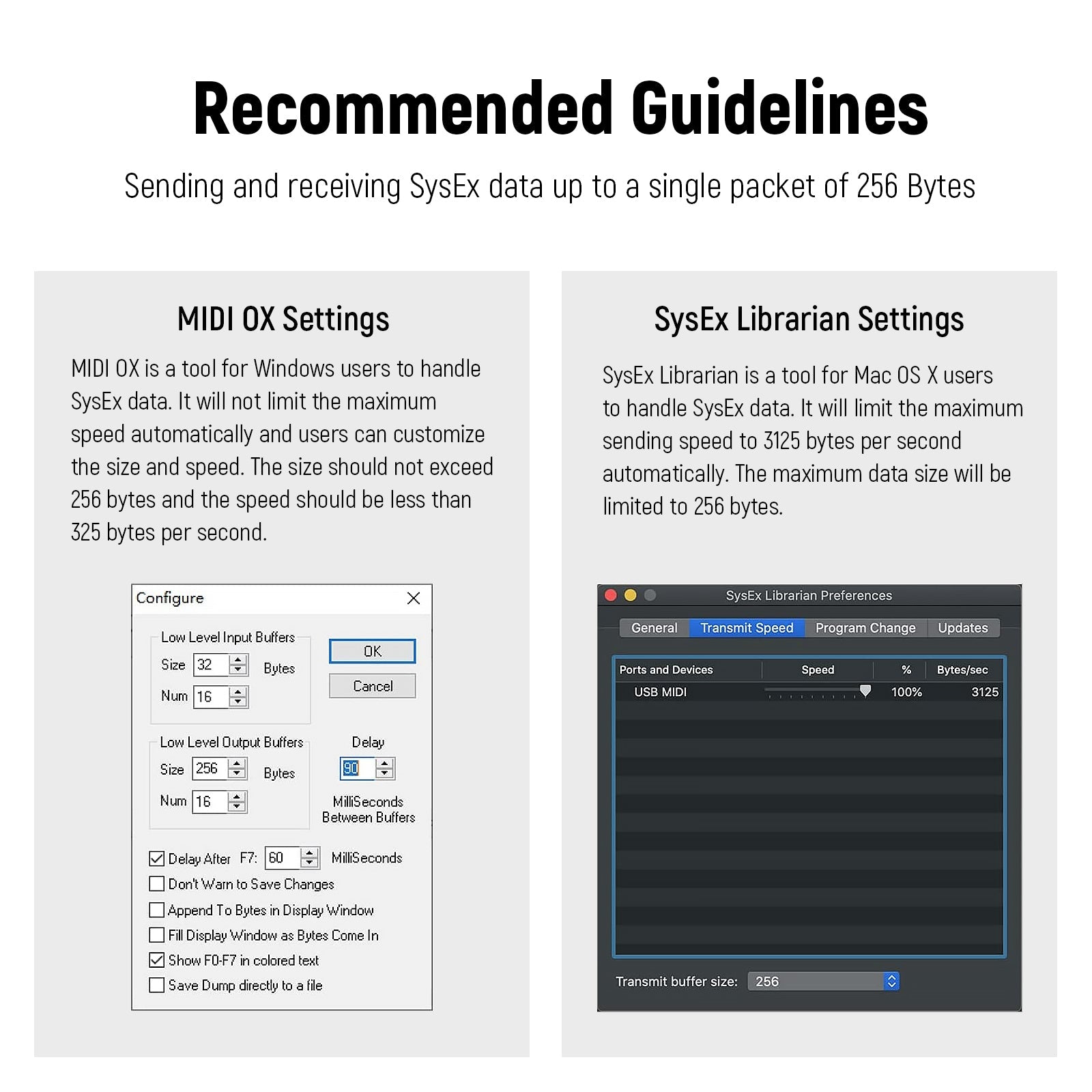 - Non inviare dati SysEx a una velocità superiore alla velocità massima del protocollo MIDI (3125 byte al secondo), poiché la larghezza di banda dell'USB è molto maggiore. Se devono essere inviati 256 byte di dati, si consiglia un ritardo superiore a 90 ms.