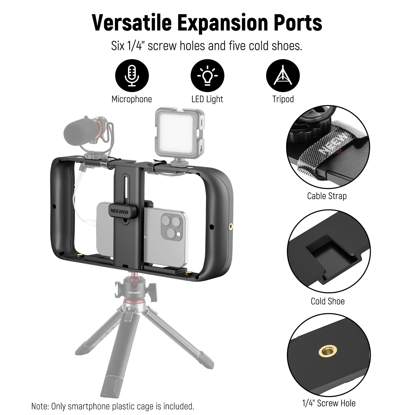 - Leggero e facile da usare: realizzato in plastica ibrida robusta ma leggera (ABS+PC), il rig è facile da tenere e offre una presa comoda per le riprese in movimento. Due fascette per cavi impediscono al cavo di penzolare o di bloccare la videocamera