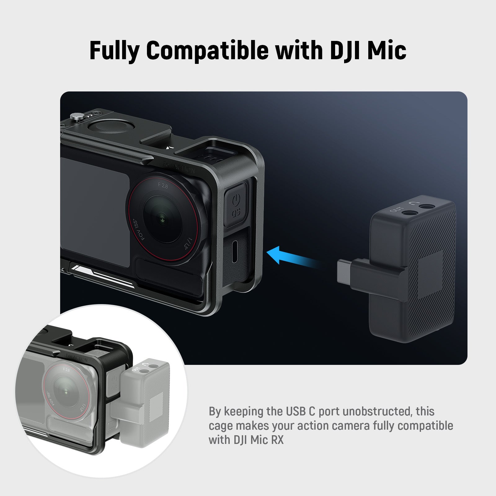 - Completamente compatibile con DJI Mic: mantenendo libera la porta USB C, questa gabbia rende la tua action camera completamente compatibile con DJI Mic RX