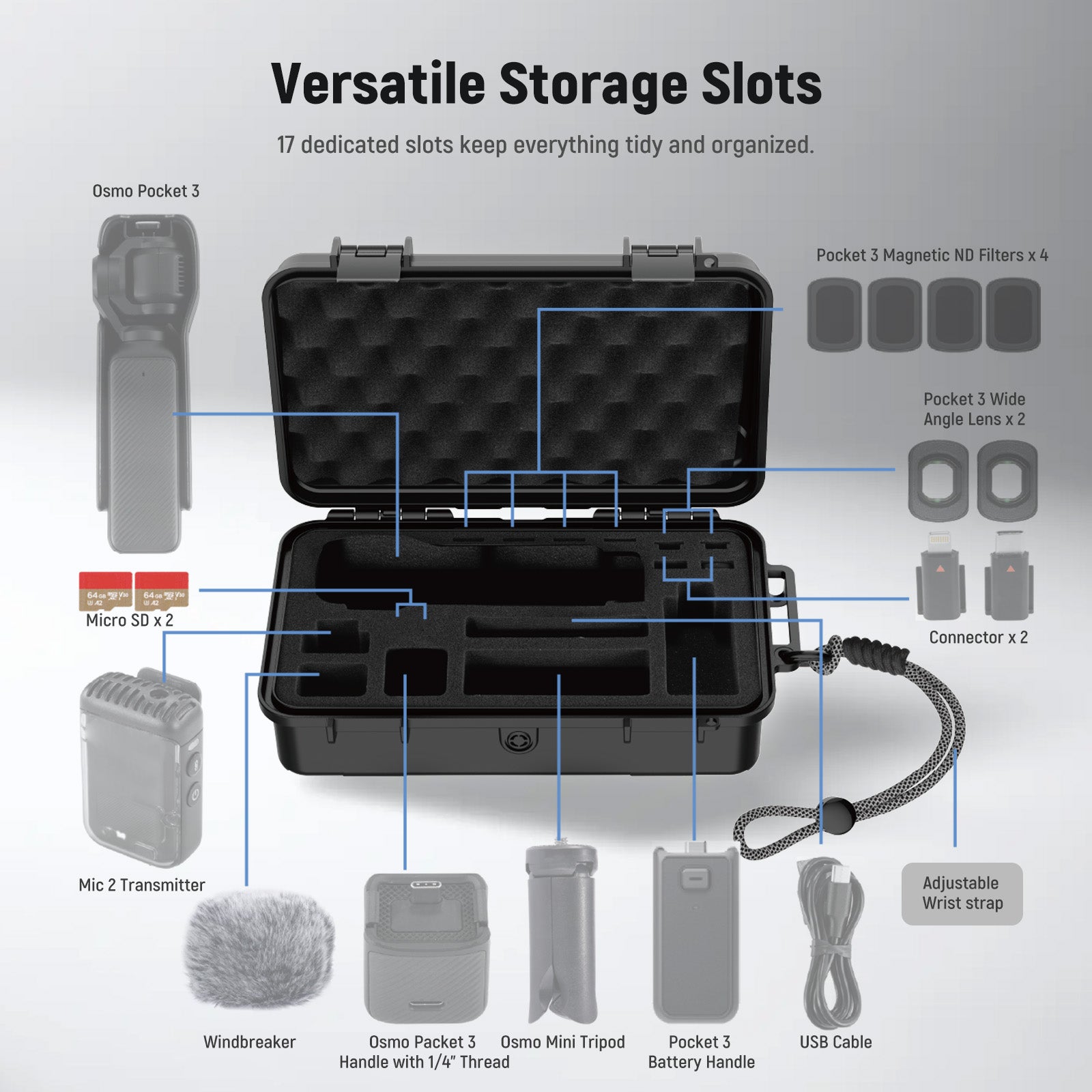 - Versatili slot di archiviazione : 17 slot dedicati mantengono tutto in ordine e organizzato. 1x slot Pocket 3; 4x slot filtro ND; 2x slot obiettivo grandangolare; 2x slot adattatore OTG; 2x slot scheda Micro SD; 1x slot trasmettitore Mic 2 compatibile con microfono DJI come Mic Mini o Mic 2; 1x slot parabrezza; 1x slot maniglia con filettatura da 1/4"; 1x slot mini treppiede; 1x slot maniglia batteria; 1x slot cavo USB
