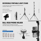 - Supporto per luce portatile reversibile : il treppiede con 4 sezioni si estende fino a 150 cm per impostare la luce del pannello a diverse altezze. Dotato di un attacco regolabile da 1/4", consente di regolare l'angolo di illuminazione in modo flessibile, supportando un'inclinazione di 180° e una rotazione di 360°. Il supporto per luce si ripiega fino a raggiungere dimensioni compatte di 43 cm per un facile trasporto.